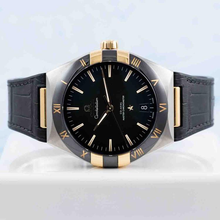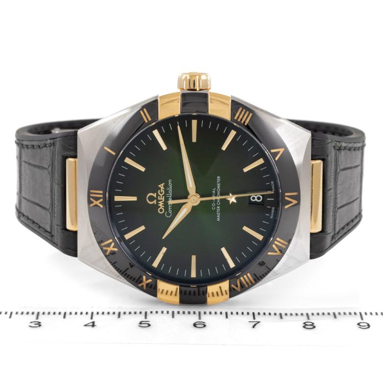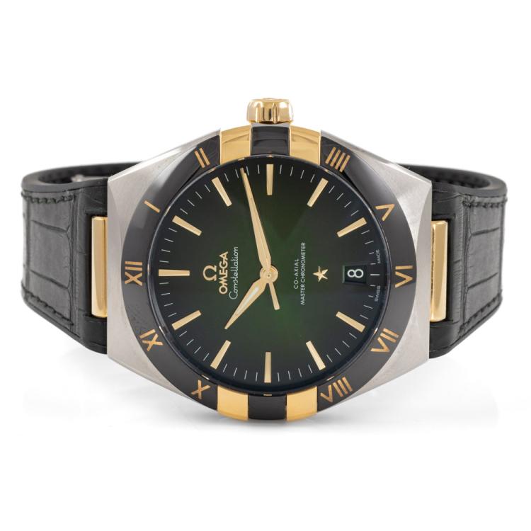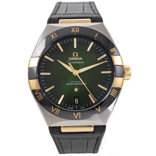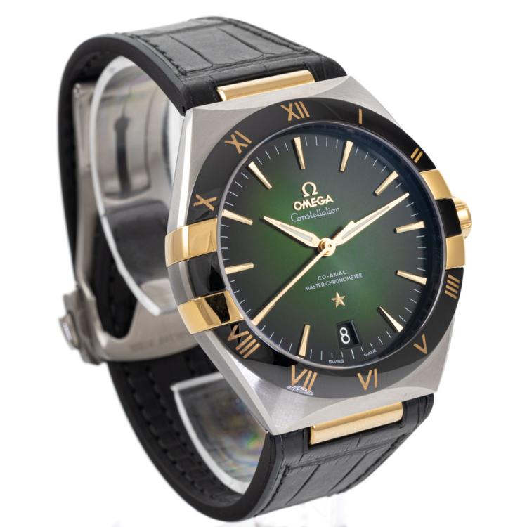 Omega Constellation 18ct yellow gold and stainless steel automatic mens watch. Dark green dial, date, case diameter: 41mm, strap length: 21.5cm, Swiss made. Ref# 131.23.41.21.10.001. With Omega dark green leather strap and clasp. With Unstamped Omega International Warranty card, Omega Pictograms card, Omega Master Chronometer card and Omega box. 3 month FSA warranty (As new, Note: minor scratch on case, and minor wear marks on strap due to being display stock)