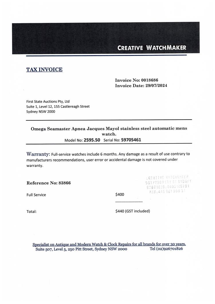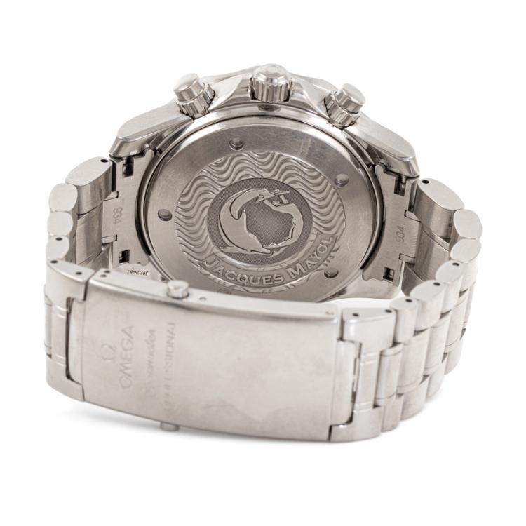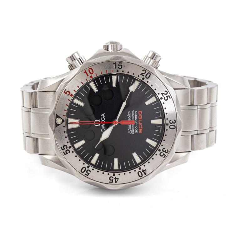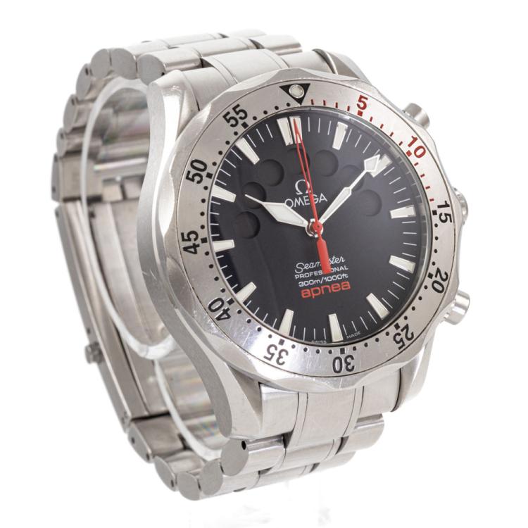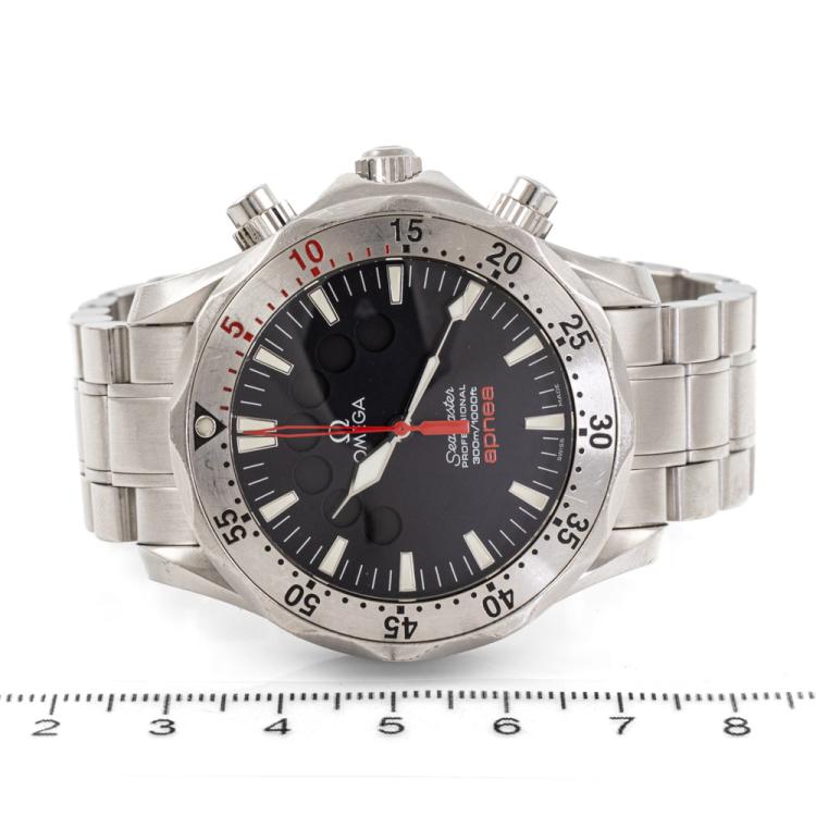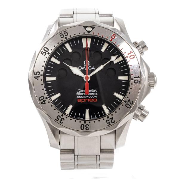 Omega Seamaster Apnea Jacques Mayol stainless steel automatic mens watch. Black dial, case diameter: 41.5mm, wrist size: 16cm, Swiss made. Ref# 2595.50. With Omega stainless steel bracelet and clasp. With Certificate of Authenticity. 6 month Creative Watchmaker Warranty from the date of full service. (Pre-owned)