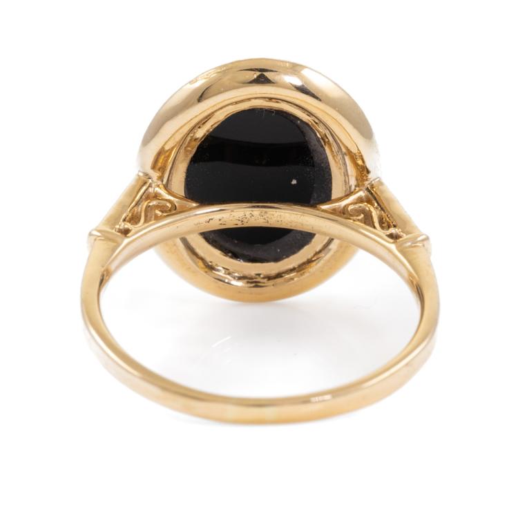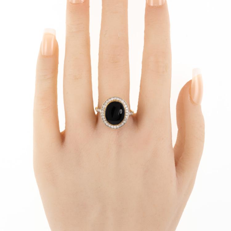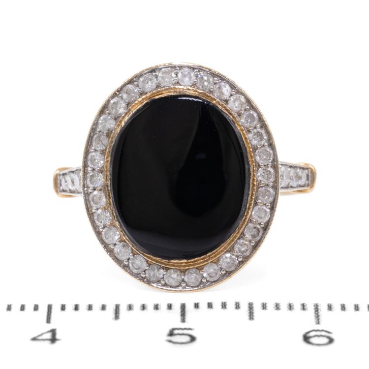 Onyx and Diamond ring with oval cabochon cut Natural Onyx of approximately 2.50ct and round Natural Diamonds totalling 0.46ct (Estimated grading: H-I P1). Ring size: Q. Band width: 1.7mm. 18ct yellow gold. Weight: 5.5g. (Pre-Owned)