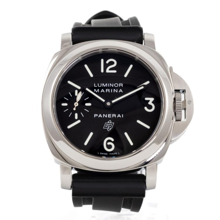 Panerai Luminor Marina stainless steel manual winding mens watch. Black dial, case diameter: 44mm, strap length: 22cm, Swiss made. Ref# PAM00005/OP6617. With black rubber strap and buckle. With Certificate of Authenticity, Panerai International Warranty card dated 29/04/2006 and Panerai box. 3 month FSA Warranty. (Pre-owned).