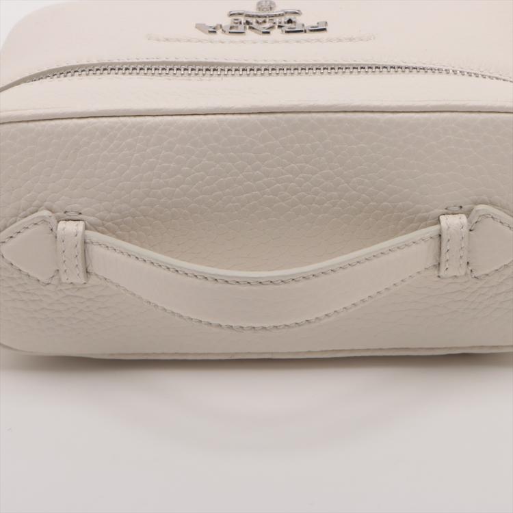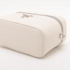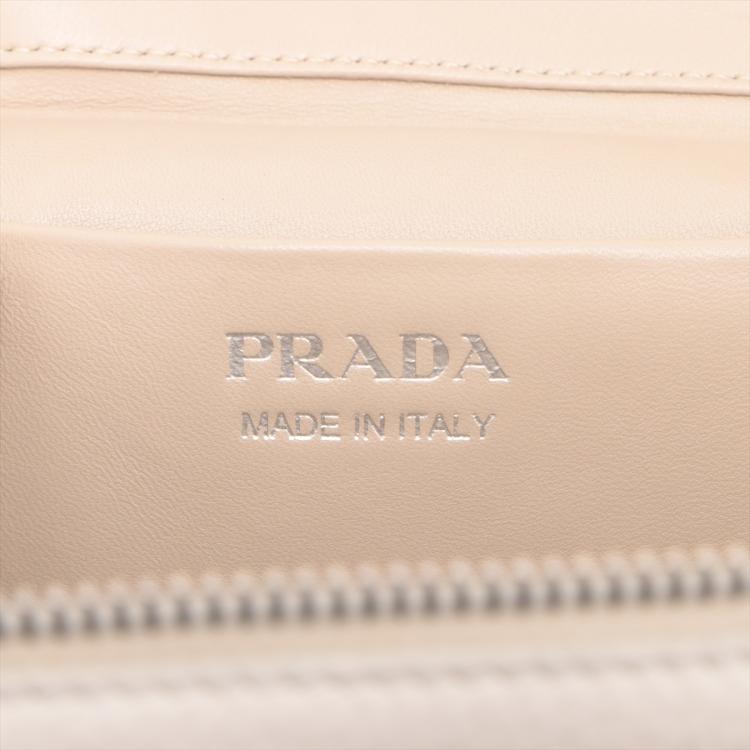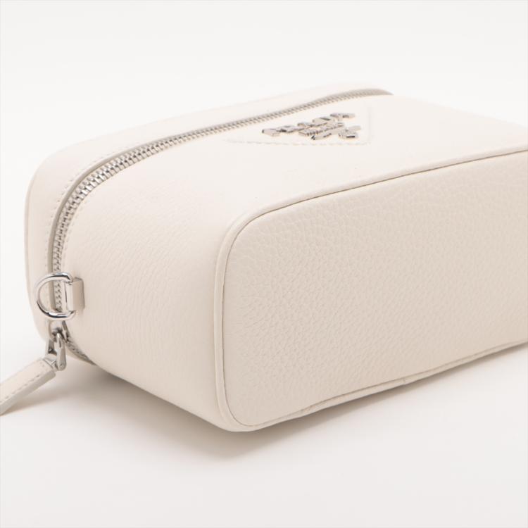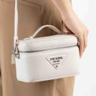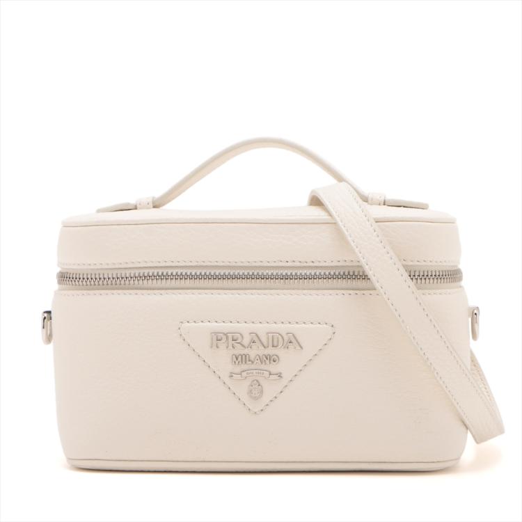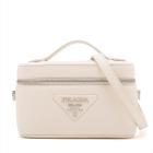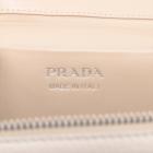 Prada leather mini-bag in white. Featuring a flat leather handle on top, silver-tone hardware, hardware lettering logo on the front. The zipper closure opens to a beige Nappa leather lining interior with a patch pocket and card slots. Approximate dimensions: 19cm(L) x 12cm(H) x 8.5cm(D), 3.5cm handle drop and 60cm adjustable strap drop. Accompanied by Prada tags and dust bags. With Entrupy Certificate of Authenticity. (Pre-owned)