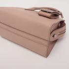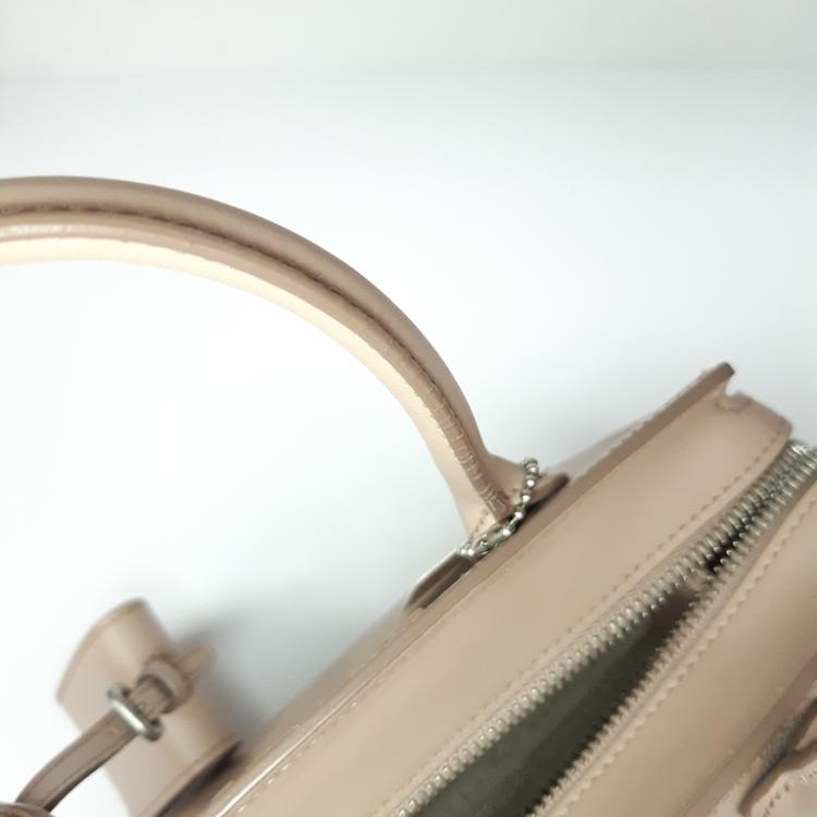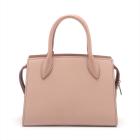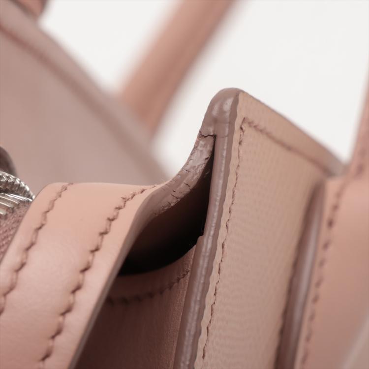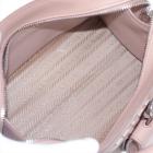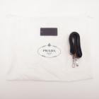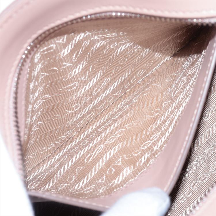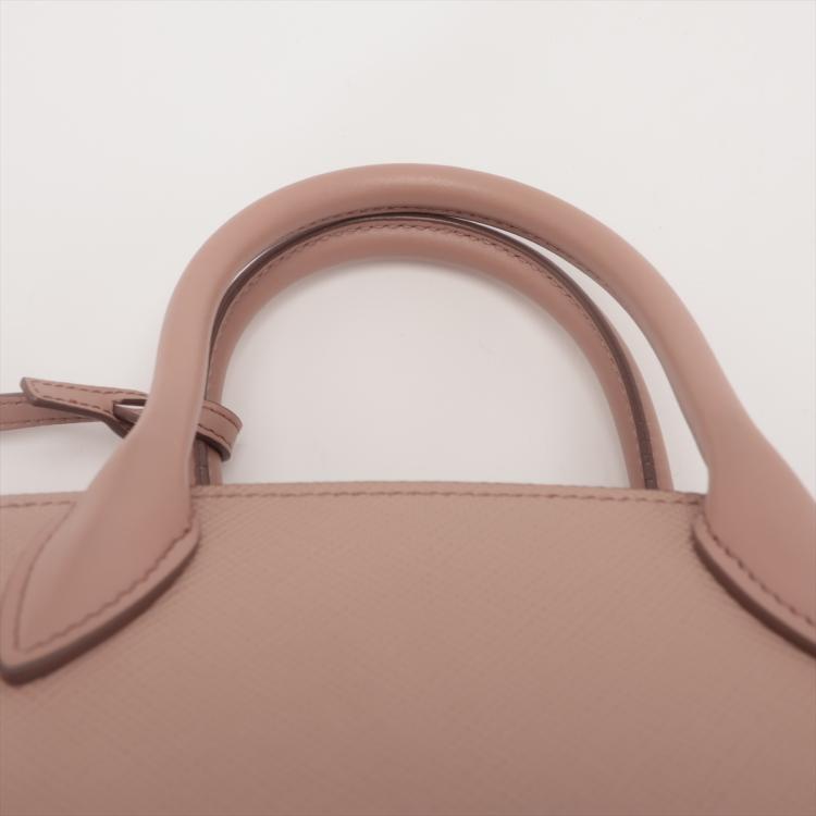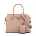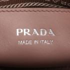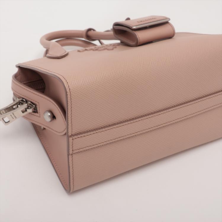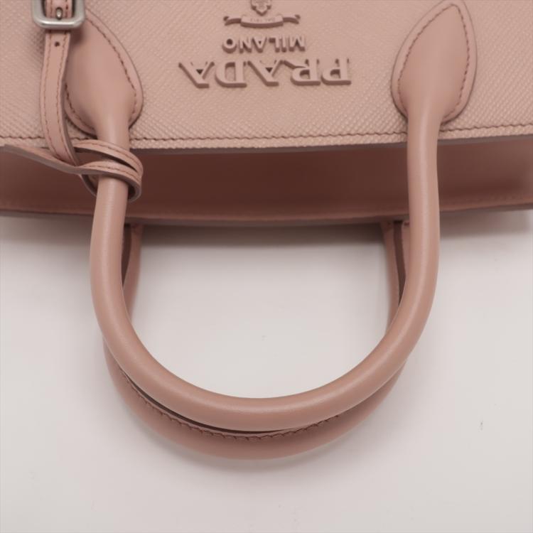 Prada Monochrome top handle bag in pink Saffiano leather. Featuring silver-toned hardware, double leather handles, matte pink logo detail at front, and detachable leather and woven shoulder straps. The zipper closure opens to a beige Prada-printed nylon interior with a patch pocket. Approximate dimensions: 22cm(L) x 15cm(H) x 12cm(D), handle drop 9cm, strap drop 52cm. Accompanied by dustbag and clochette pouch. With Entrupy Certificate of Authenticity. (Pre-owned)
