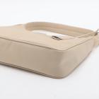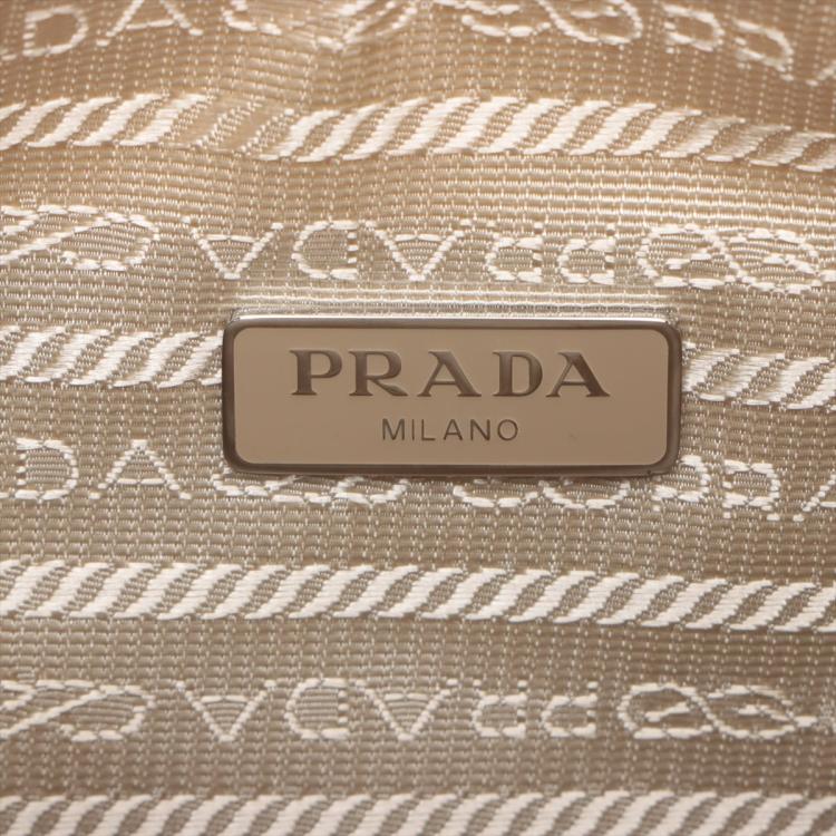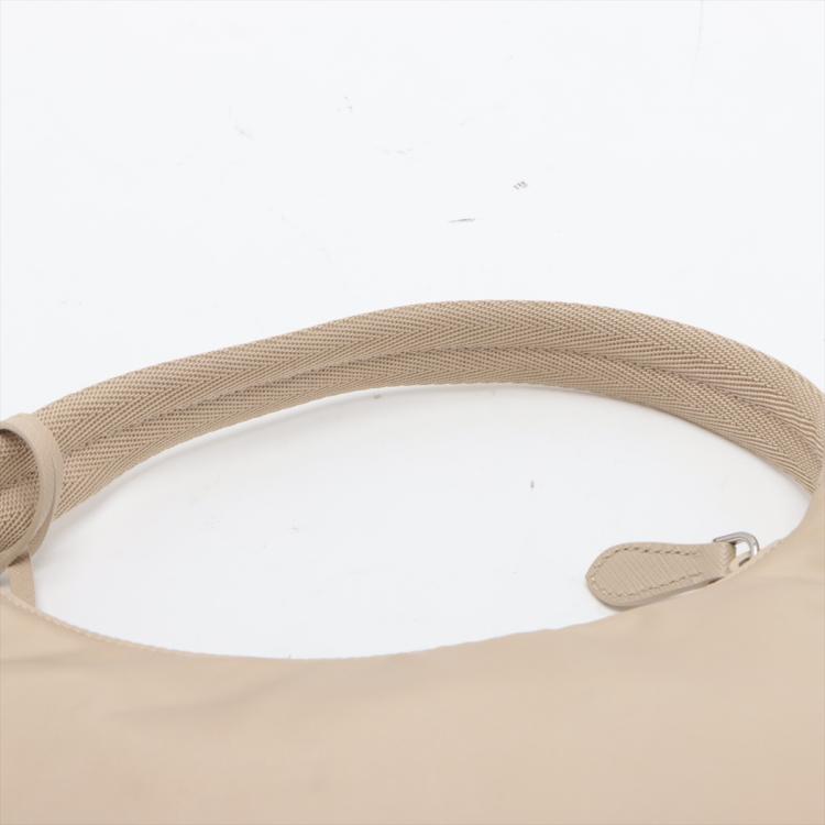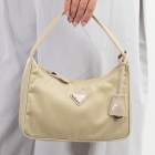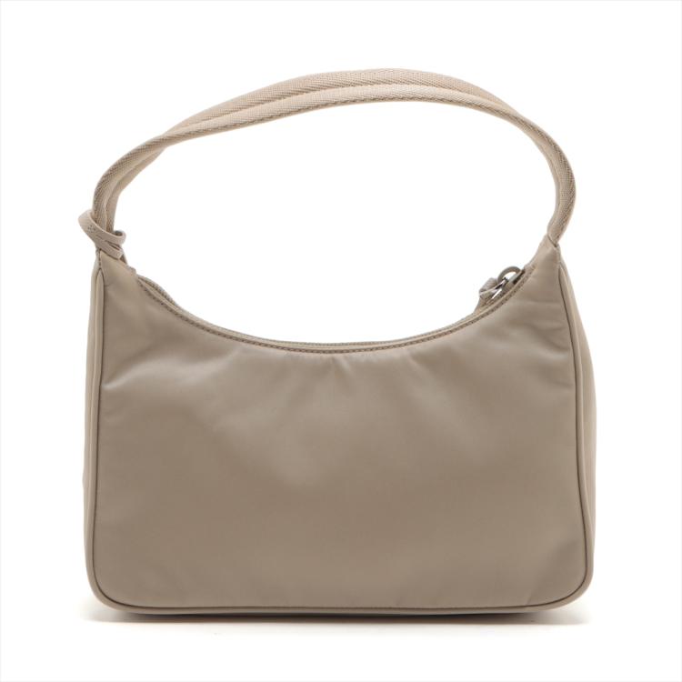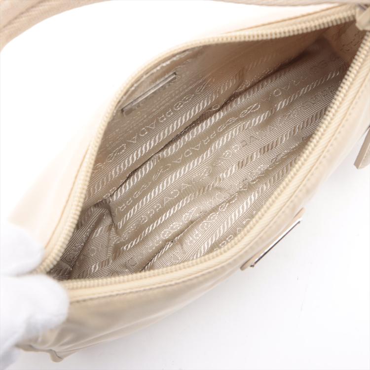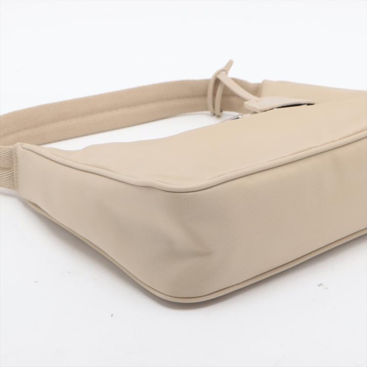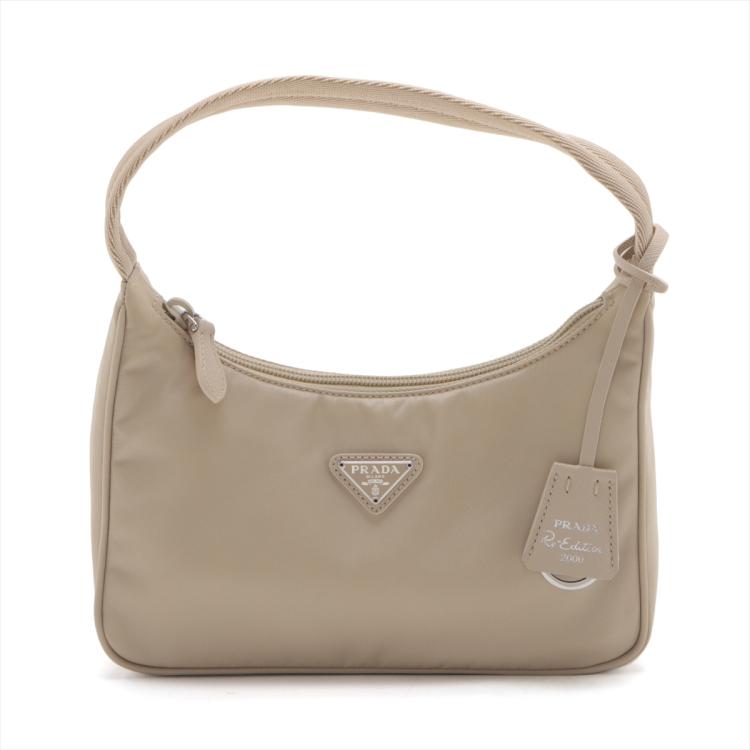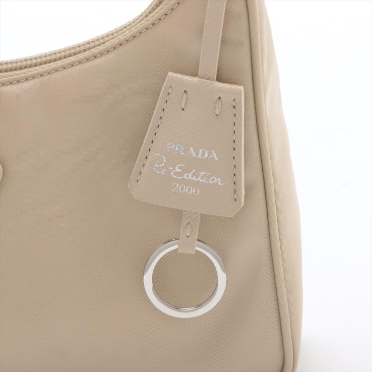 Prada Re-Edition 2000 mini-bag in beige Tessuto nylon. Featuring silver-toned hardware, woven tape handle, triangle logo plate at front. The top zipper closure opens to a logo-print Re-Nylon lining interior. Approximate dimensions: 22.5cm(L) x 17.5cm(H) x 5.5cm(D), 15cm handle drop. Accompanied by a Saffiano leather tag with a key ring, Prada certification card and a dust bag. With Entrupy Certificate of Authenticity. (Pre-owned)
