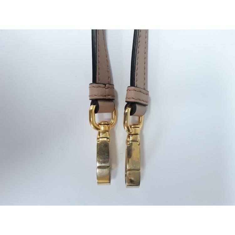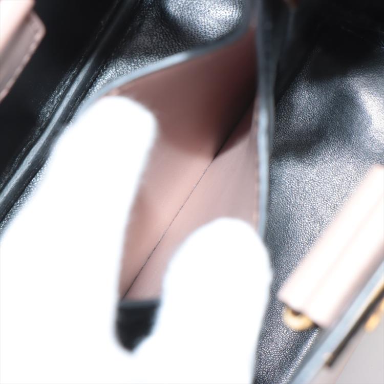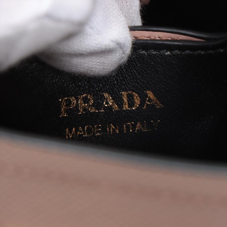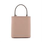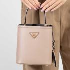Prada small Panier bag in powder pink Saffiano leather. Featuring single leather handle, gold tone hardware, leather triangle plate with logo detail at the front, magnetic button closure on top. This opens to black Nappa leather lining interior with a centre pocket. Approximate dimensions: 17.5cm(W) x 18.5cm(H) x 11cm(D), 11cm handle drop, 51cm removable strap drop. Accompanied by Prada certificate card and dust bag. With Entrupy Certificate of Authenticity. (Pre-owned)