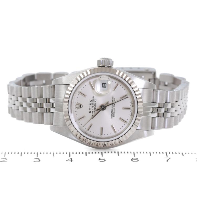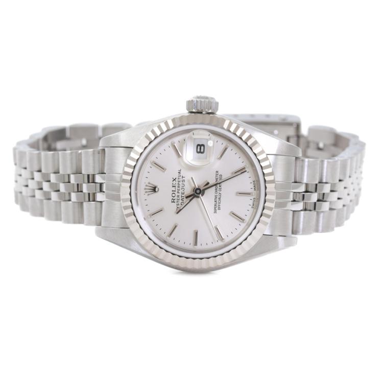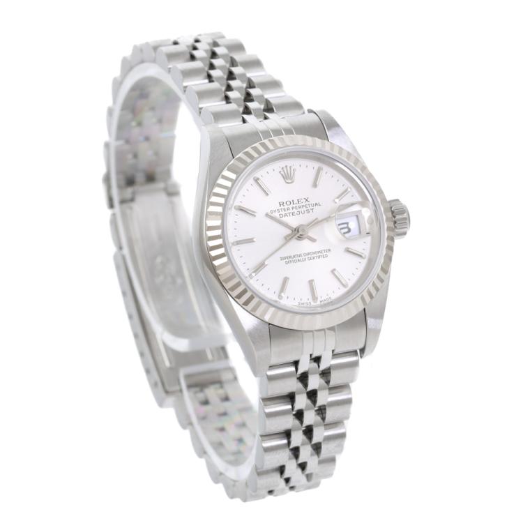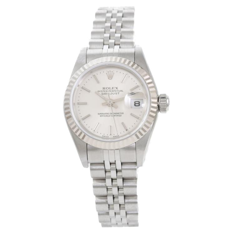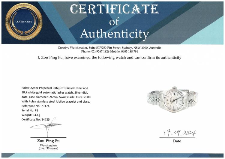 Rolex Oyster Perpetual Datejust stainless steel and 18ct white gold automatic ladies watch. Silver dial, date, case diameter: 26mm, wrist size: 17cm, Swiss made. Ref# 79174. Circa: 2000. With Rolex stainless steel Jubilee bracelet and clasp. With Certificate of Authenticity, Rolex Guarantee Certificate dated 19/09/2001 and Rolex box. 3 month FSA warranty (Pre-owned).