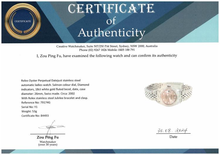 Rolex Oyster Perpetual Datejust stainless steel automatic ladies watch. Salmon colour dial, Diamond indicators, 18ct white gold fluted bezel, date, case diameter: 26mm, wrist size: 16cm, Swiss made. Ref# 79174G. Circa: 2002. With Rolex stainless steel Jubilee bracelet and clasp. With Certificate of Authenticity and Rolex box. 3 month FSA warranty. (Pre-owned)