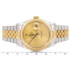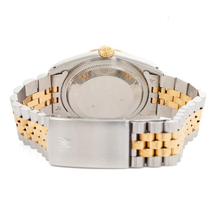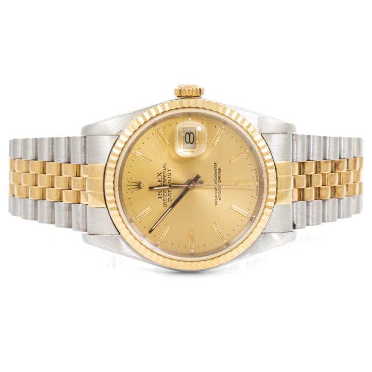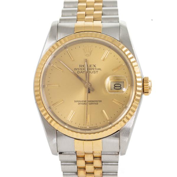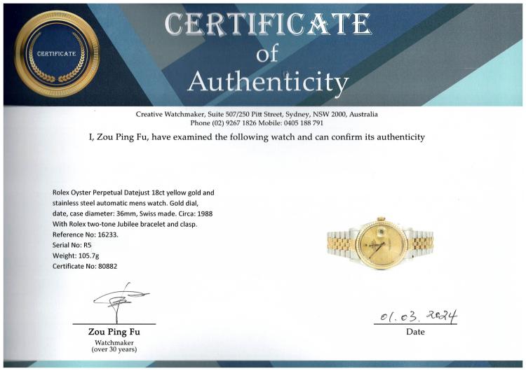 Rolex Oyster Perpetual Datejust 18ct yellow gold and stainless steel automatic mens watch. Gold dial, date, case diameter: 36mm, wrist size: 19cm, Swiss made. Ref# 16233. Circa: 1988. With Rolex two-tone Jubilee bracelet and clasp. With Certificate of Authenticity and Rolex box. 3 month FSA warranty (Pre-owned)