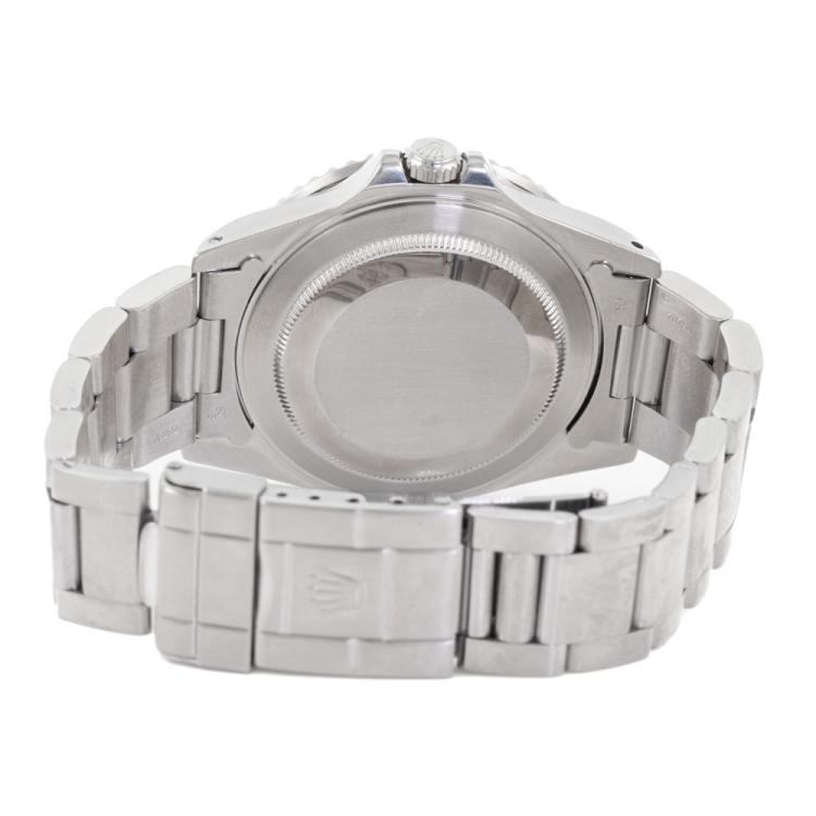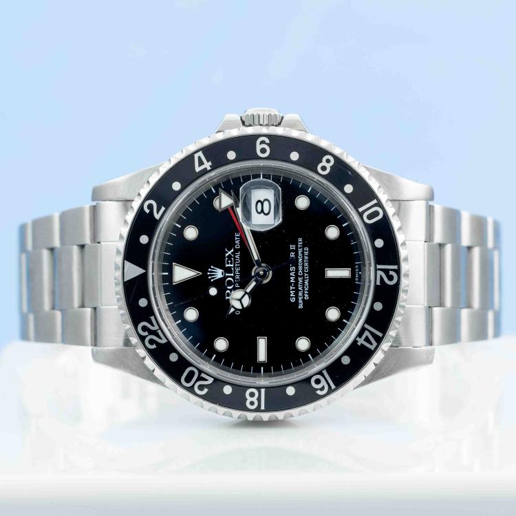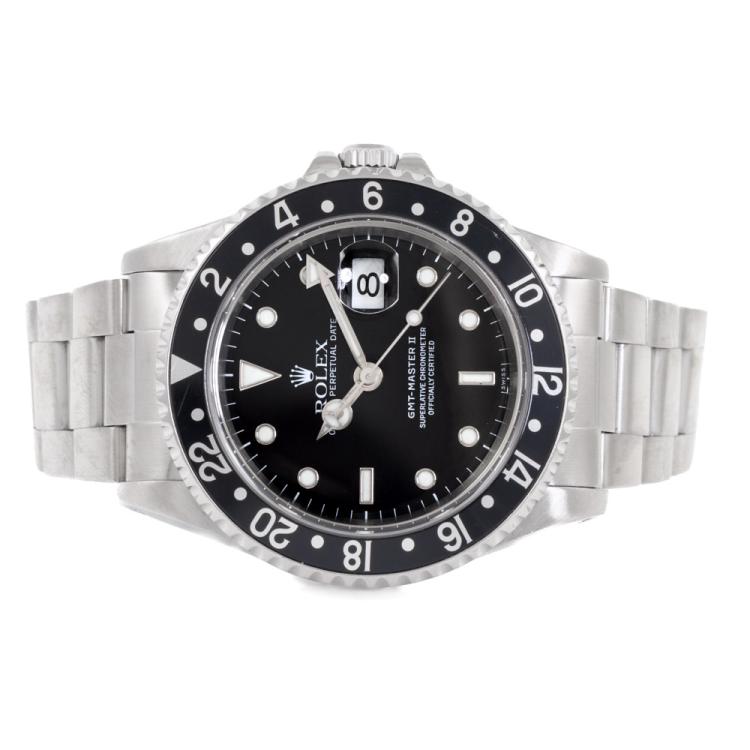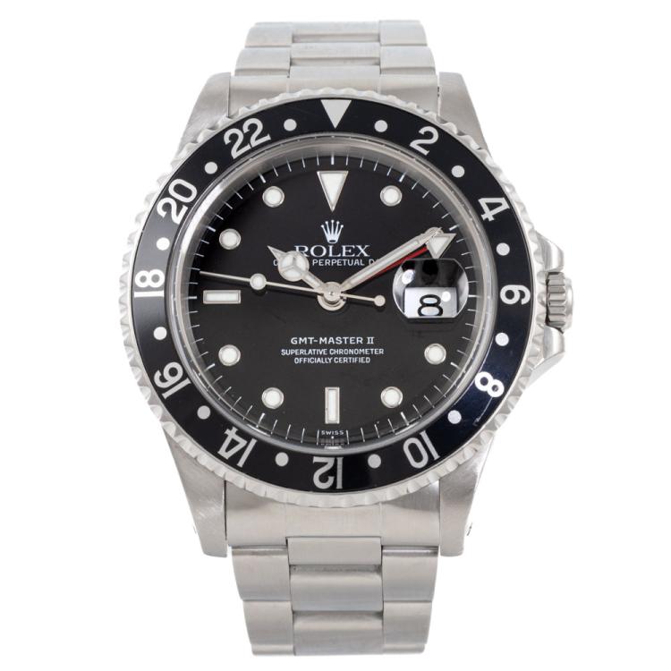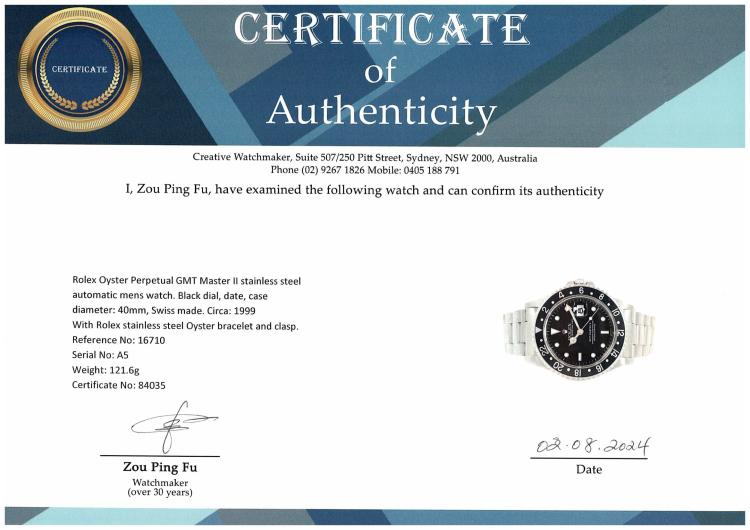 Rolex Oyster Perpetual GMT Master II stainless steel automatic mens watch. Black dial, date, case diameter: 40mm, wrist size: 17.5cm, Swiss made. Ref# 16710. Circa: 1999. With Rolex stainless steel Oyster bracelet and clasp. With Certificate of Authenticity and Rolex box. 3 month FSA warranty (Pre-owned)