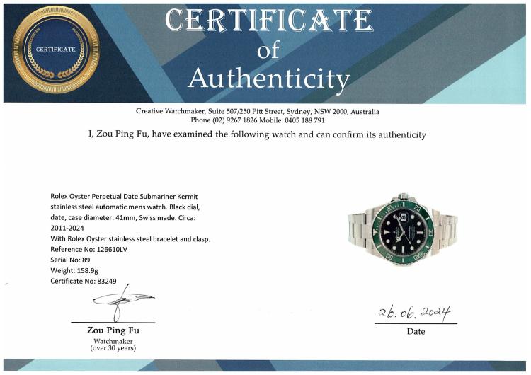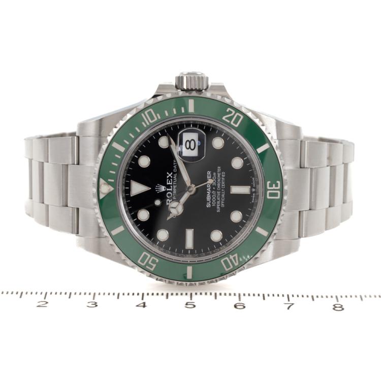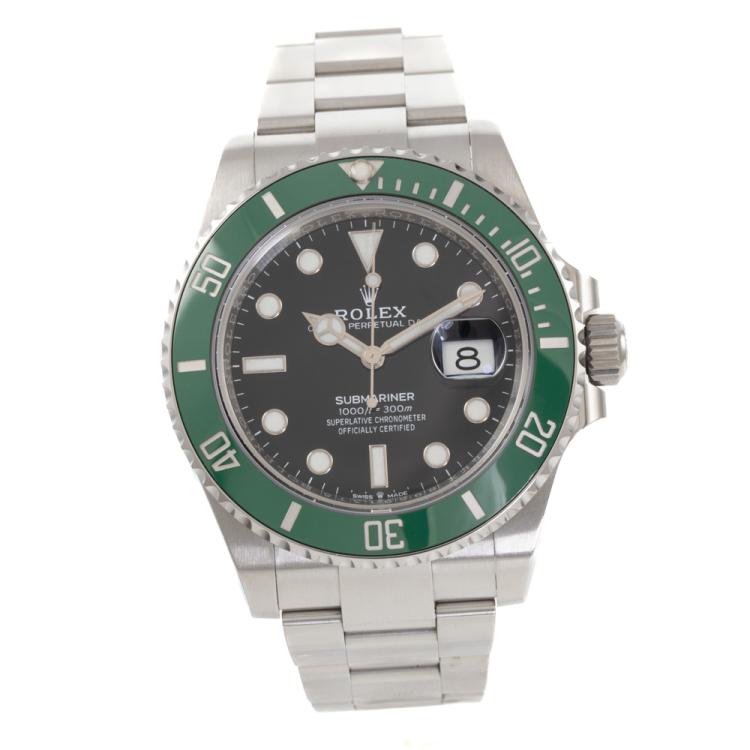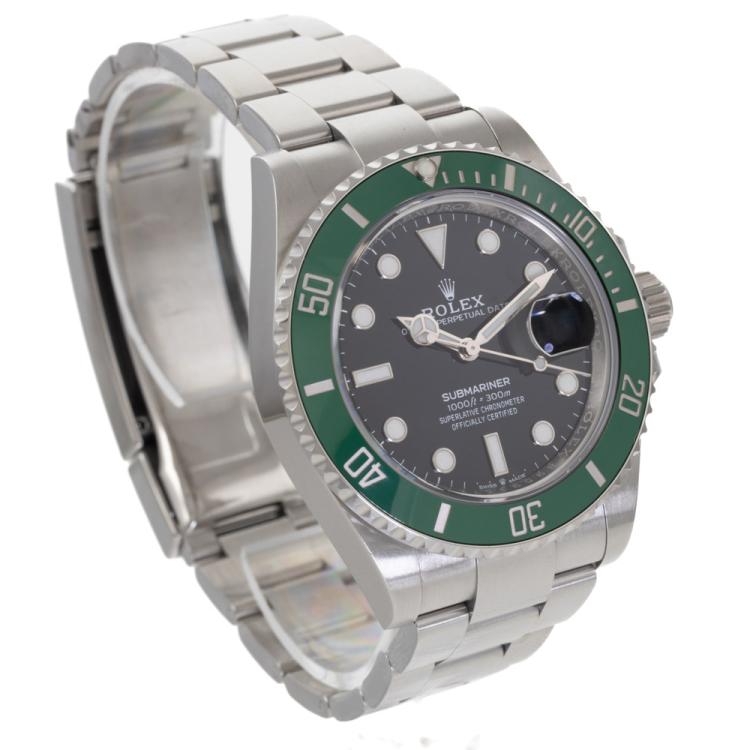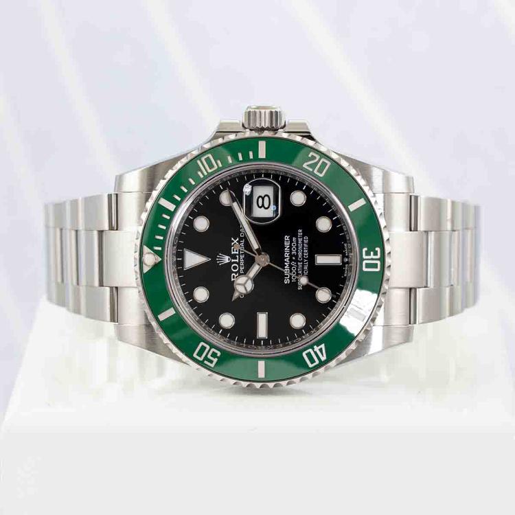 Rolex Oyster Perpetual Date Submariner Kermit stainless steel automatic mens watch. Black dial, date, case diameter: 41mm, wrist size: 20.5cm, Swiss made. Ref# 126610LV. Circa: 2011-2024. With Rolex Oyster stainless steel bracelet and clasp. With Certificate of Authenticity, Rolex International Guarantee Card dated 12/10/2020 and Rolex box. Balance of 5 year Rolex manufacturer warranty applies. (Pre-owned)