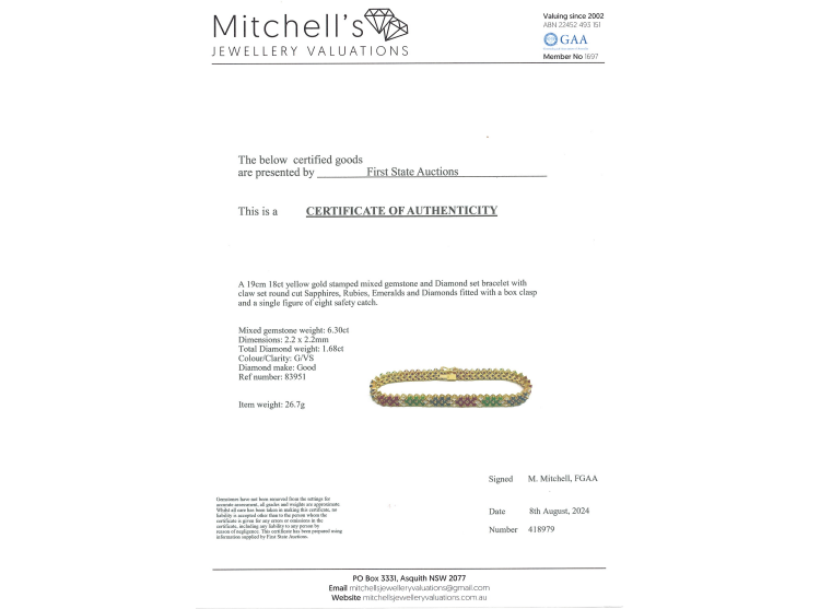 Mixed Gemstone and Diamond bracelet with round Rubies, Sapphires and Emeralds totalling approximately 6.30ct and round Natural Diamonds totalling approximately 1.68ct (Estimated grading: G VS). 18ct yellow gold. Length: 19cm. Weight: 26.7g. With Certificate#418979. (Pre-owned)
