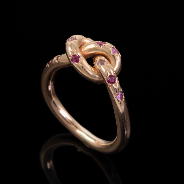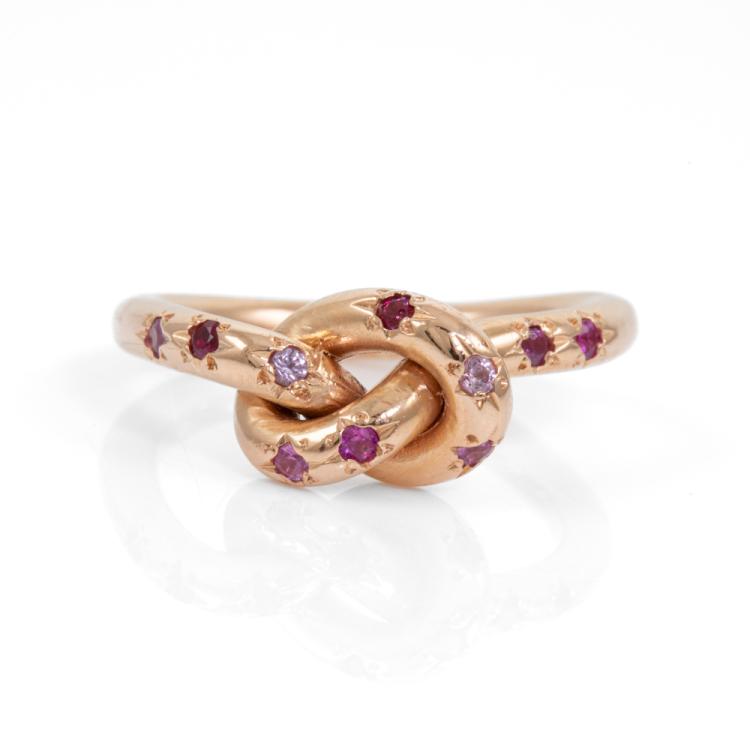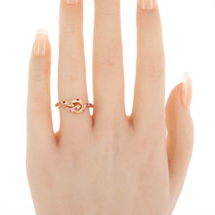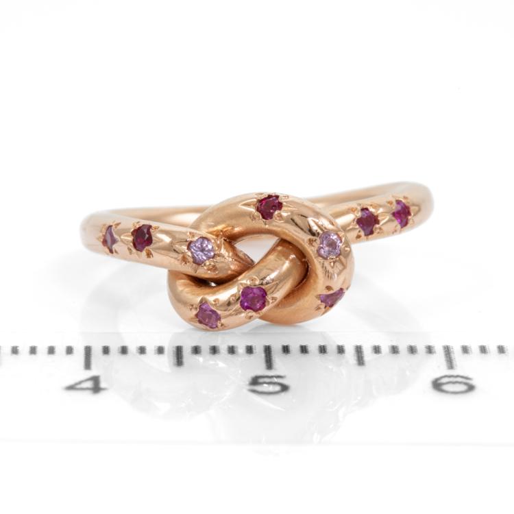 Sapphire and Ruby ring with round natural pink Sapphires totalling approximately 0.16cts and round Natural Rubies totalling approximately 0.04cts. 18ct rose gold. Ring size H½ - ring resize is not recommended. Band Width: 2.3mm. Weight: 5.8g. (Pre-owned)