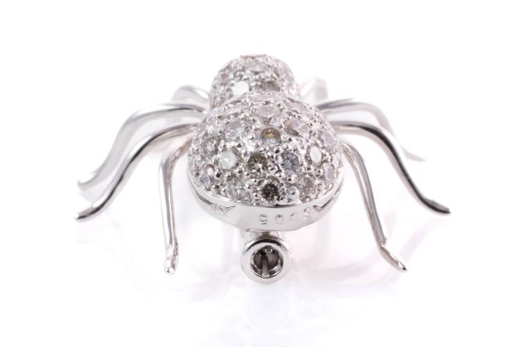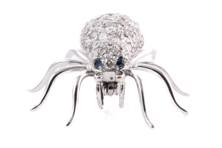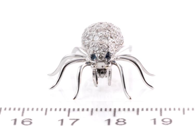 Spider design brooch/pendant with 2 round Sapphires totalling 0.05ct and round Diamonds totalling 1.43ct (Estimated grading: H-I SI). 18ct white gold. Weight: 5.4g. (Pre-owned)