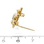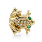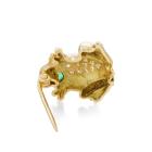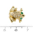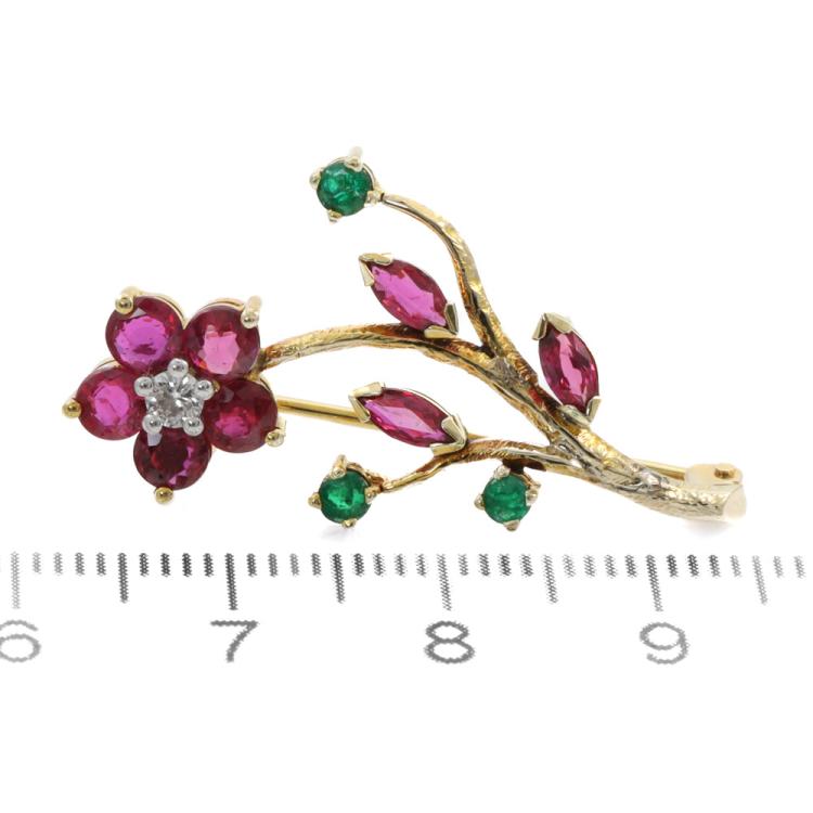 Set of Two Brooch. 1) Floral designed brooch with round & marquise cut natural Rubies totalling approx. 1.00ct, round natural Emeralds totalling approx. 0.15ct and a round natural Diamond of 0.05ct. 14ct yellow gold. Dimension: 3.4cm x 1.7cTom. 2) Frog designed brooch with round natural Emeralds totalling approx. 0.10ct and round natural Diamonds totalling approx. 0.15ct. 18ct yellow gold. Size: approximately 1.5cm x 1.5mm. Total weight: 7.1g. (Pre-owned)