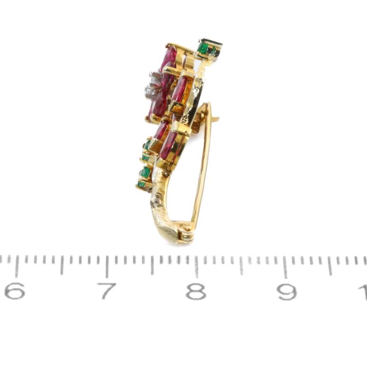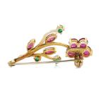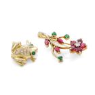 Set of Two Ruby, Emerald, Diamond Brooch