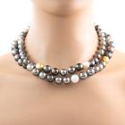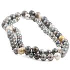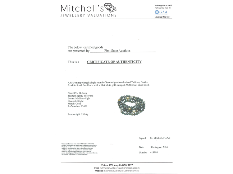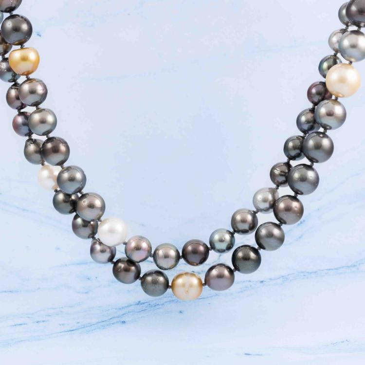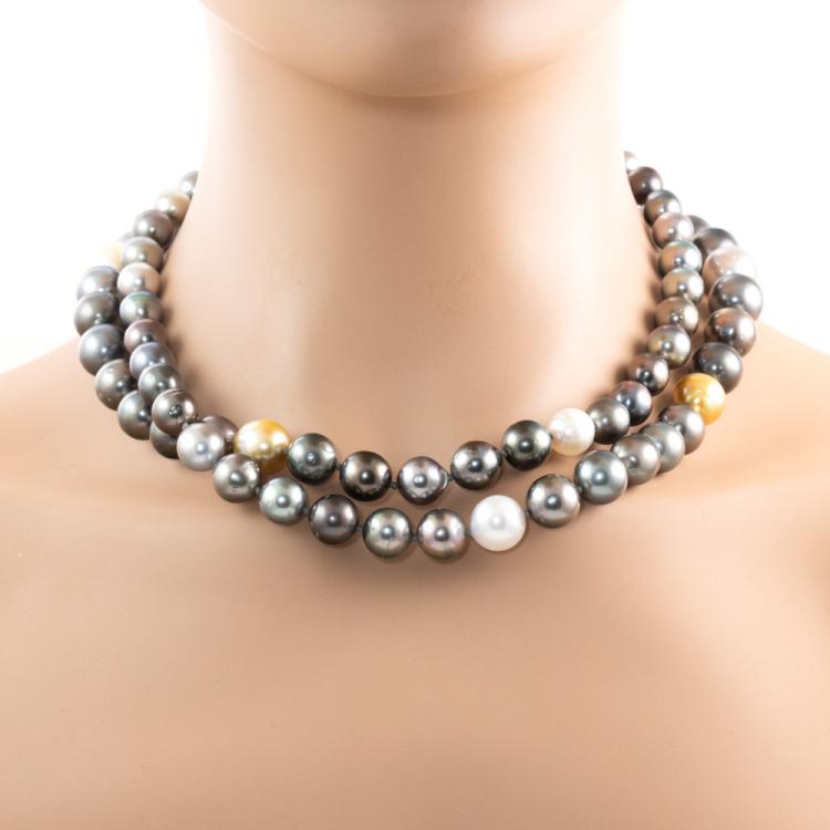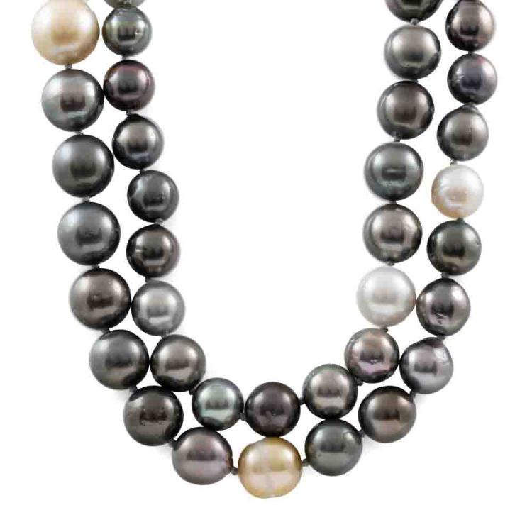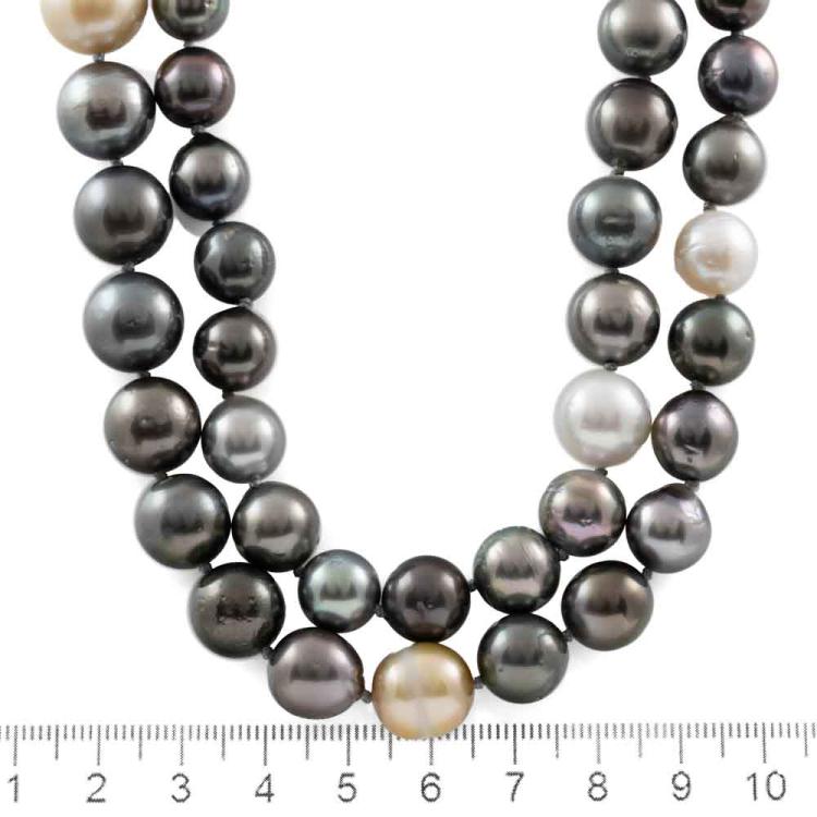 Pearl rope length necklace with 74 graduated mixed shape Tahitian, Golden and White South Sea pearls of 8.9mm - 14.8mm. 14ct white gold 12mm ball clasp. Length: 93.5cm. Weight: 155.6g. With Certificate# 418980 . (Pre-owned)