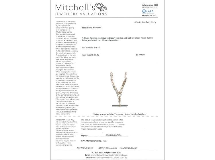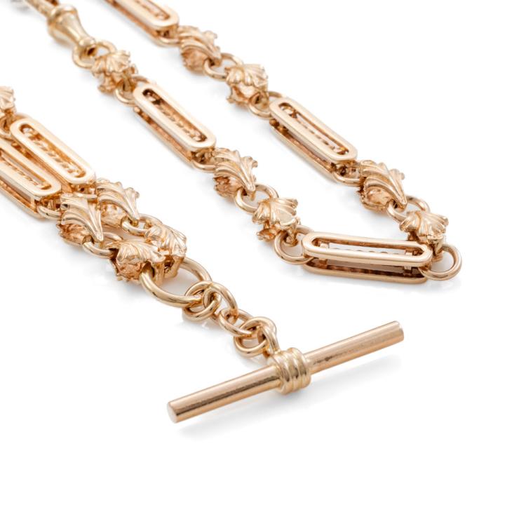 Fancy link chain necklace with T-bar. 9ct rose gold. Length: 69.0cm. Weight: 60.4g. It can be used as Pocket Watch fob chain. With Valuation Certificate #419090 (Pre-owned)