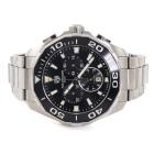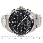 TAG Heuer Aquaracer stainless steel quartz mens watch. Black chronograph dial, date, case diameter: 43mm, wrist size: 17cm, Swiss made. Ref# CAY111A. With TAG Heuer stainless steel bracelet and clasp. With Certificate of Authenticity, TAG Heuer International Guarantee card dated 10/11/2016 and TAG Heuer box. 3 month FSA warranty (Pre-owned)