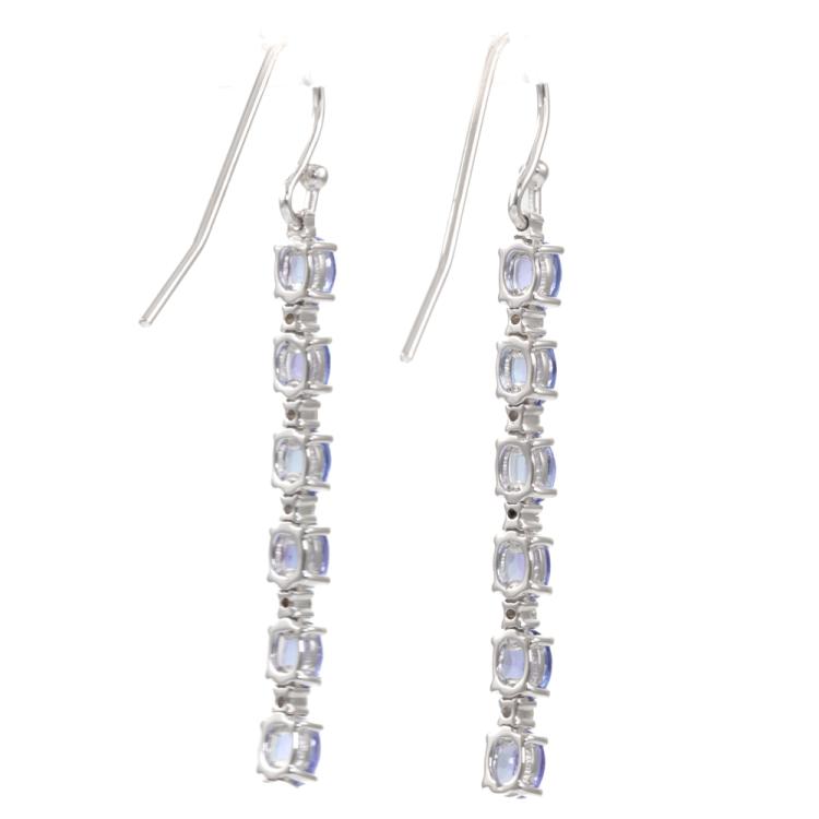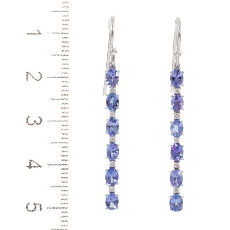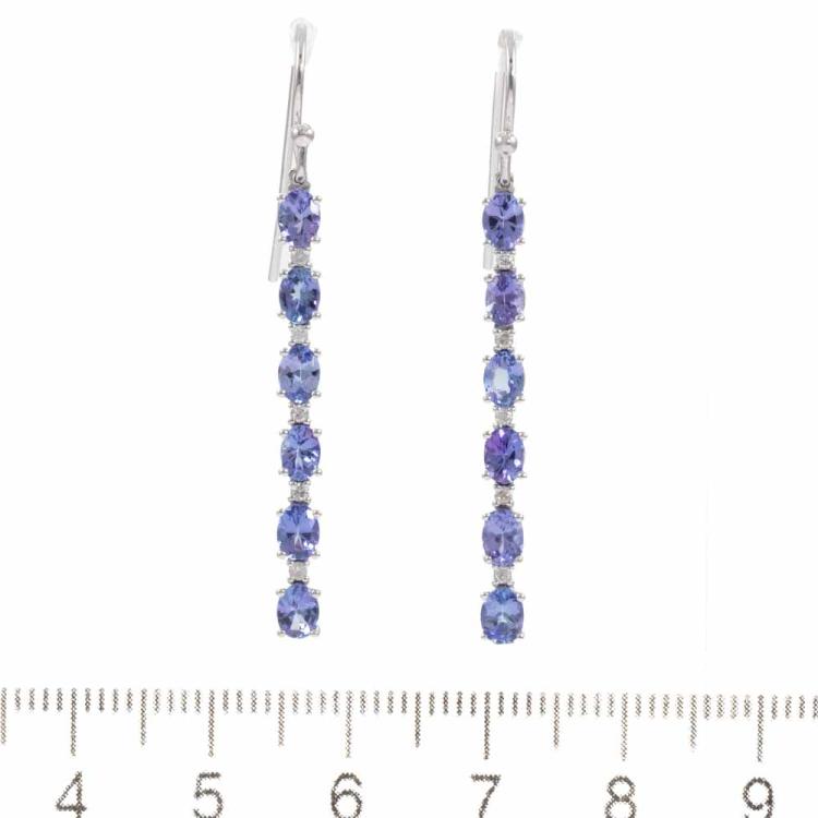 Tanzanite and Diamond drop shepherd hook earrings with oval natural Tanzanite's totalling approximately 2.40ct and natural Diamonds totalling 0.12ct. 18ct white gold. Length 4.3cm. Weight 3.4g. (Pre-owned)