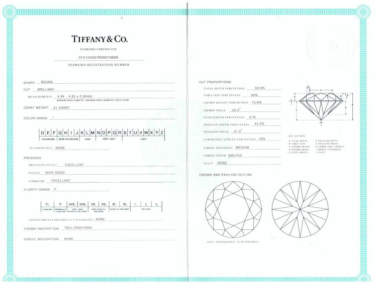 Tiffany & Co. Harmony Diamond Engagement ring with round brilliant cut Natural Diamond of 0.41ct (with Tiffany & Co. Diamond Certificate graded as I IF #37415405/R06070899). Platinum-950. Ring size G½ -ring resizing is not recommended. Weight: 3.1g. With Tiffany & Co. box. (Pre-owned)