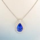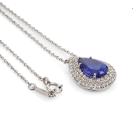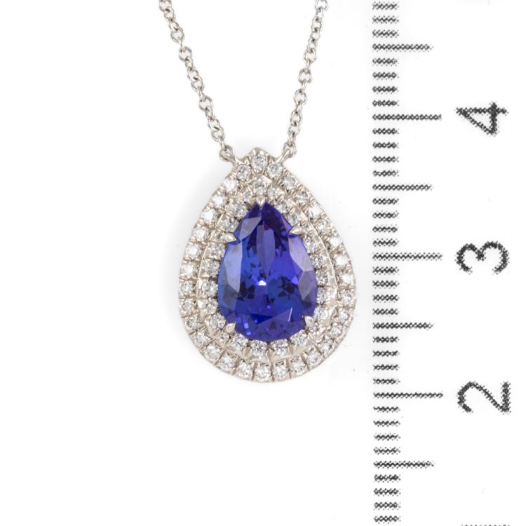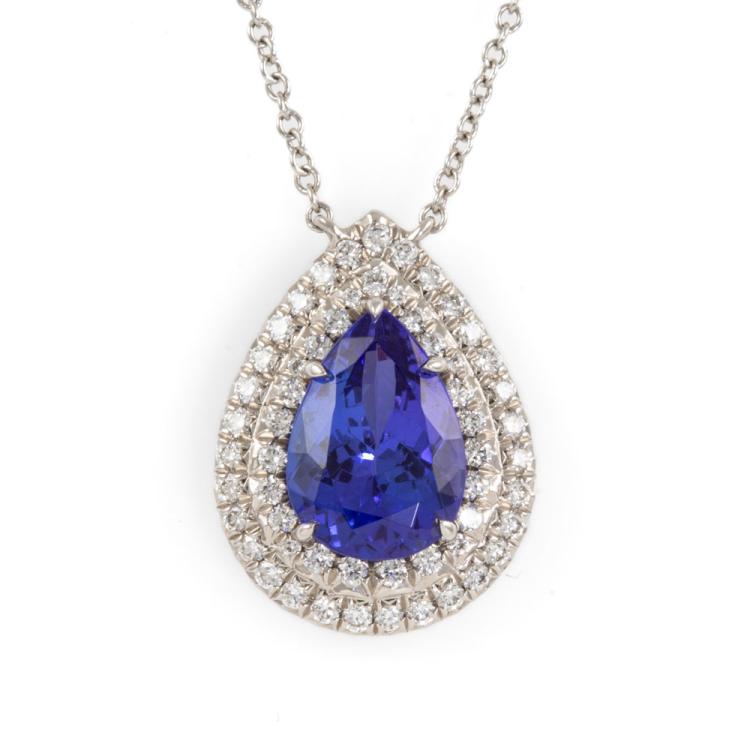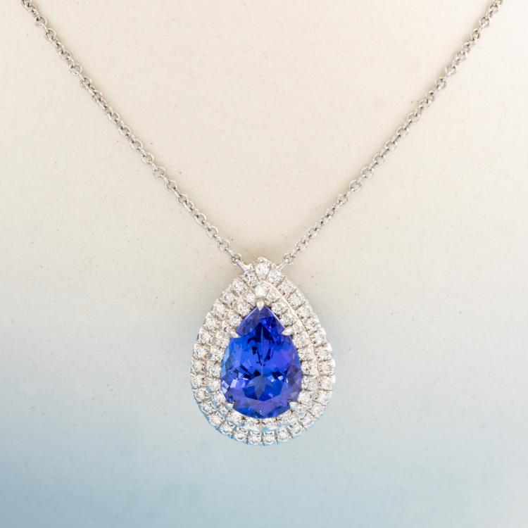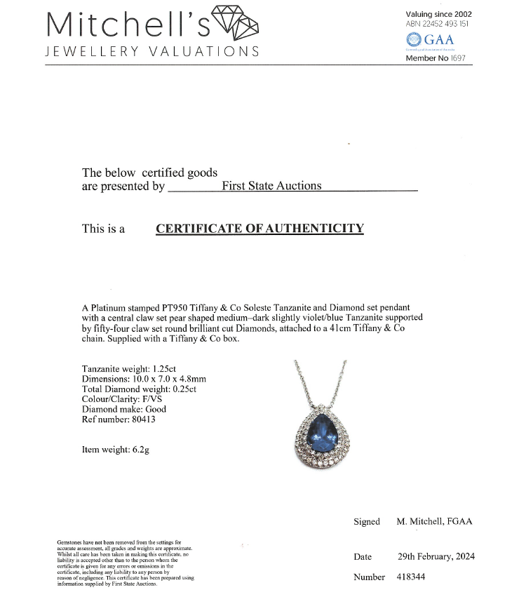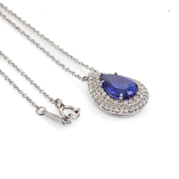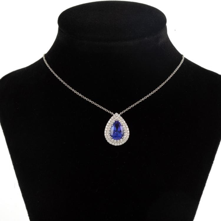 Tiffany & Co Soleste Tanzanite and Diamond pendant with a pear shape Natural Tanzanite of 1.25ct and round Natural Diamonds totalling 0.25ct (Estimated grading: F VS). Platinum 950 with attached Tiffany & Co chain. Length: 41cm. Weight: 6.2g. With Tiffany & Co. box. With Certificate #418344. (Pre-owned)