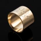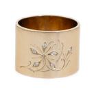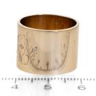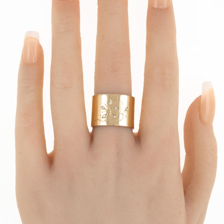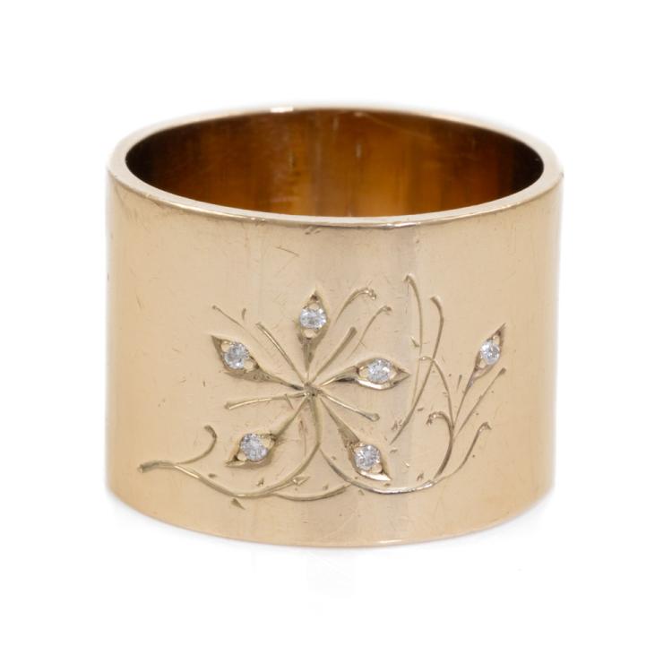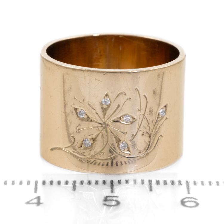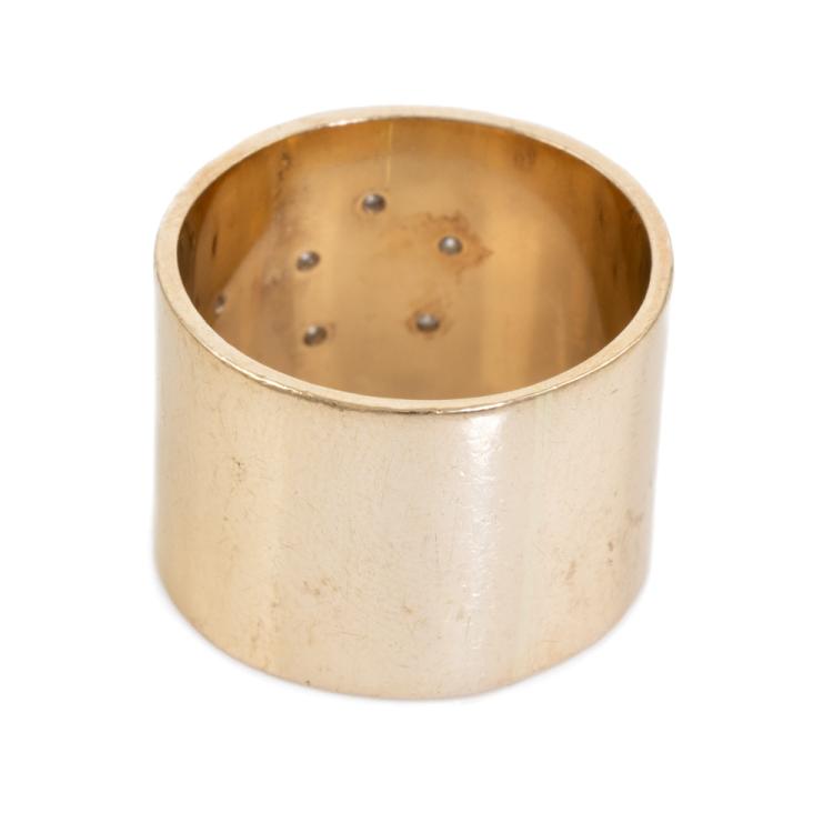 Wide band ring with 6 round natural Diamond totalling approximately 0.03ct. 9ct yellow gold. Ring size: O, ring resizing is not recommended. Band width: 14.5mm. Weight: 9.8g. (Pre-owned)