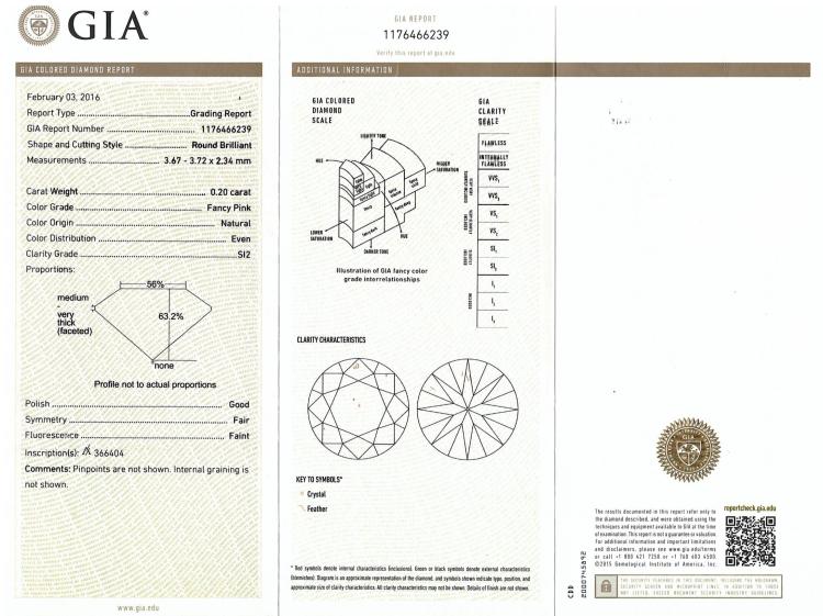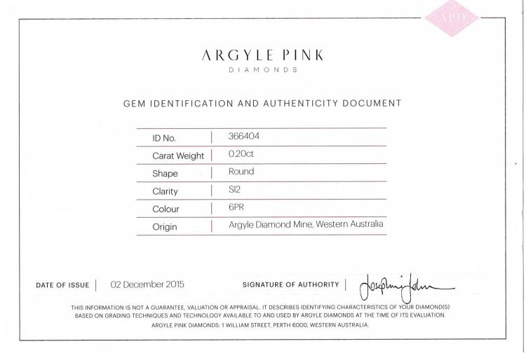 A loose round brilliant cut Argyle Natural Pink Diamond of 0.20ct (With Argyle Pink Diamonds Certificate graded as 6PR SI2 #366404 and GIA Report graded as Natural Fancy Pink Even SI2 #1176466239). (As New)