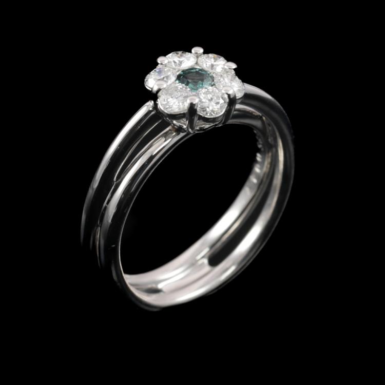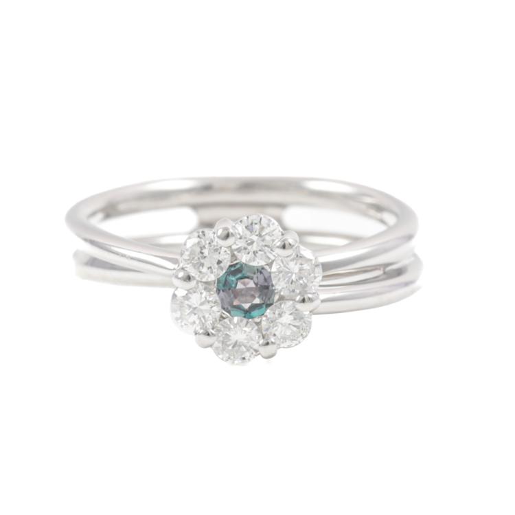 Alexandrite and Diamond with round Natural Alexandrite of 0.25ct (with moderate colour change from Bluish Green to Purple) and round Natural Diamonds totalling 0.47ct (Estimated grading: G-H VS-SI). Platinum - 900. Ring size L - ring resizing is not recommended. Maximum band width: 4.9mm. Weight: 6.4g (Pre-owned)