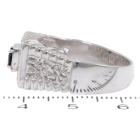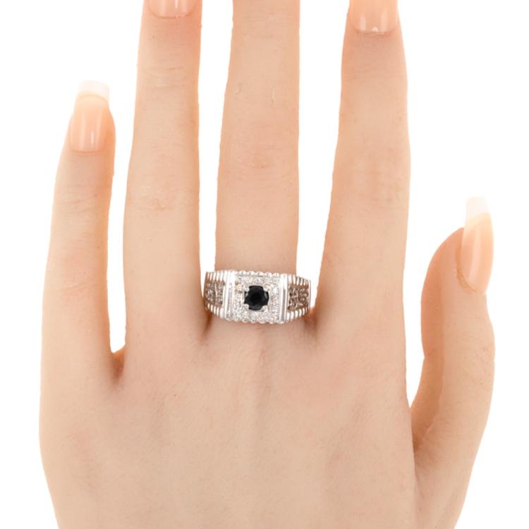 Sapphire and Diamond mens ring with round natural blue Sapphire of 0.30ct and round natural Diamonds totalling approximately 0.16ct. 18ct white gold. Ring size S. Band width: 4.7mm - 7.1mm. Weight: 8.9g (As New)