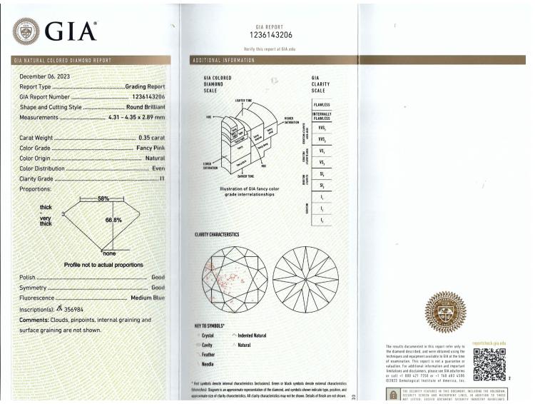 A loose round brilliant cut Natural Argyle Pink Diamond of 0.34ct. With copy of Argyle Pink Diamonds Check Results graded as 7PP P1, Argyle Lot #356984 and GIA Report 0.35ct graded as Natural Fancy Pink Even P1 #1236143206. (As new)