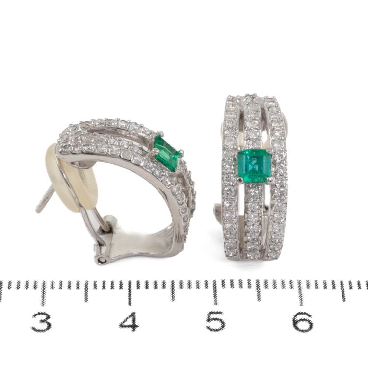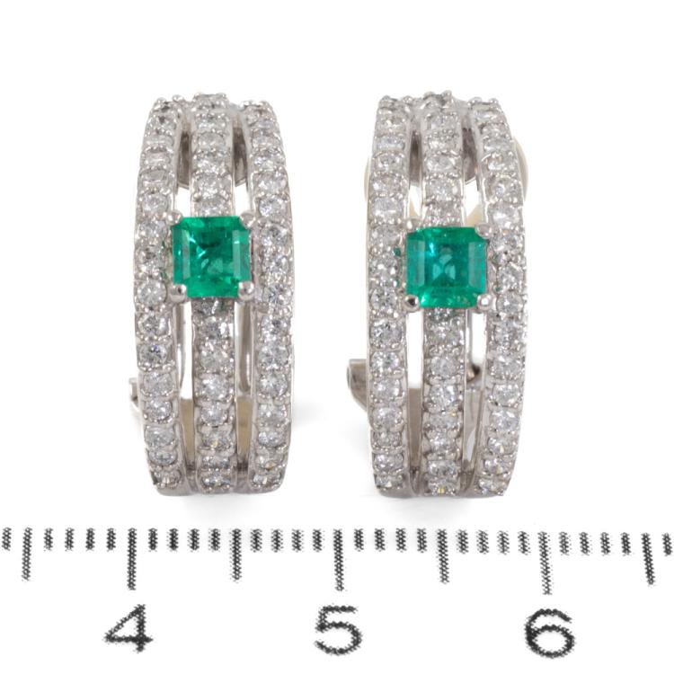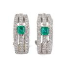 Emerald and Diamond clip on earrings (for pierced ears) with emerald cut natural Emeralds totalling 0.44ct and round natural Diamonds totalling 1.00ct (Estimated grading: G-H SI). Platinum 900. Weight: 9.6g. (Pre-owned)