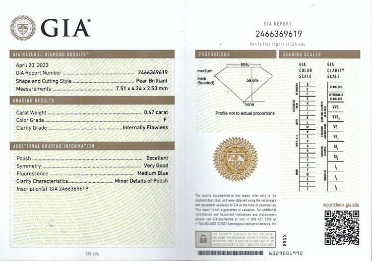 A loose pear shape natural Diamond of 0.47ct (with GIA Summary Report graded as F Internally Flawless #2466369619). (New)