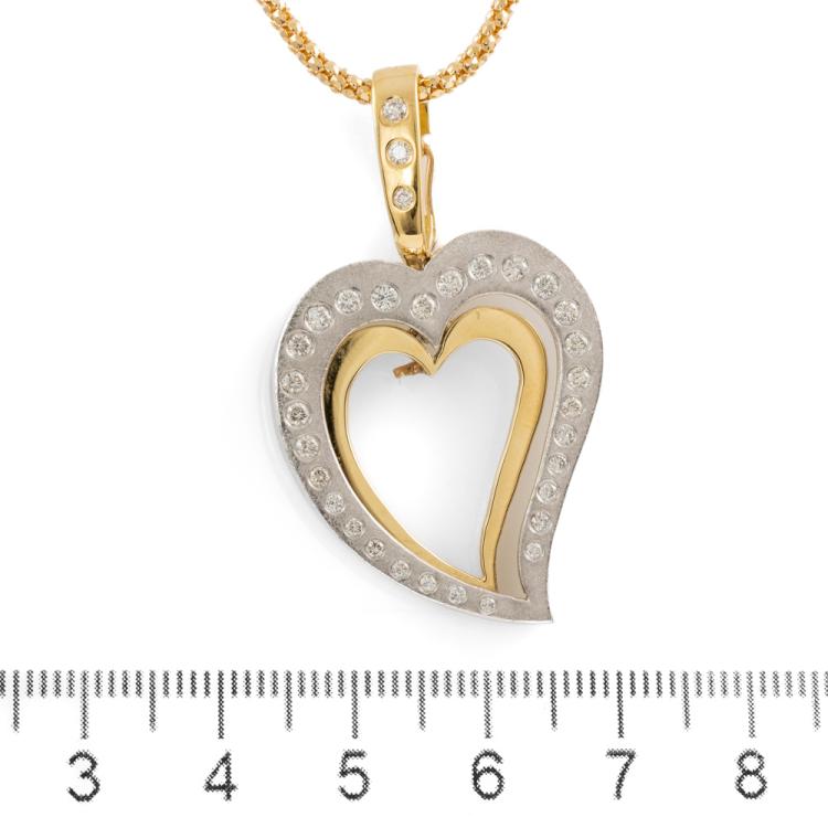 Heart design enhancer pendant with round natural Diamonds totalling approximately 0.50ct (Estimated grading: I-J SI). 18ct yellow & white gold with 18ct yellow gold adjustable 60cm chain. Weight: 16.5g. (Pre-owned)