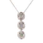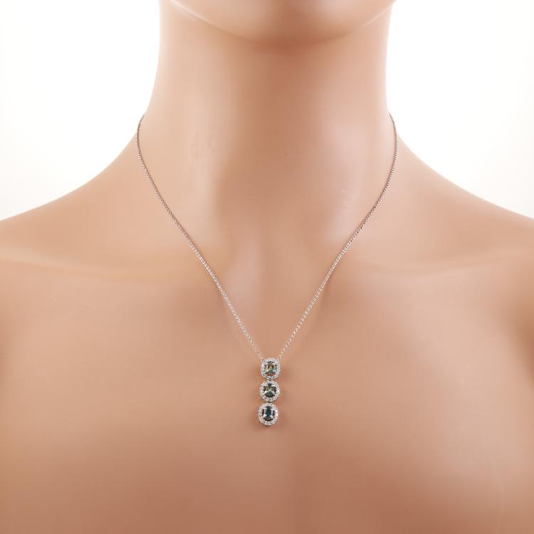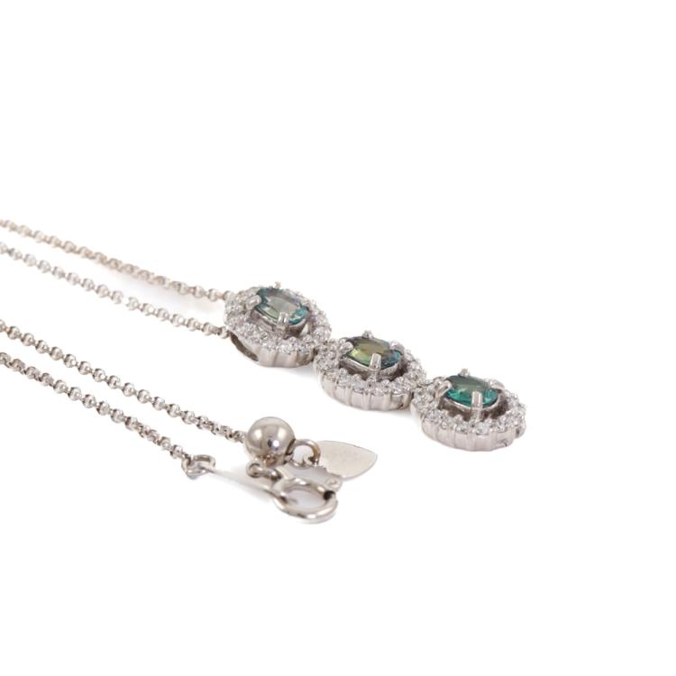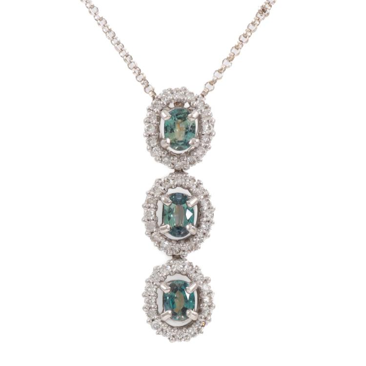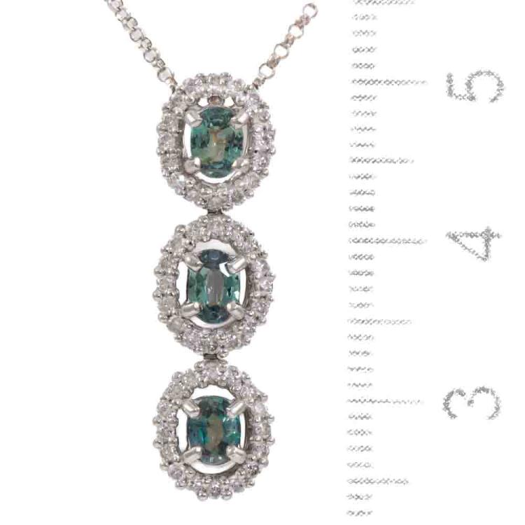 Alexandrite and Diamond pendant with 3 oval shape Natural Alexandrites totalling 0.62ct (colour change from green to moderately purple) and round Natural Diamonds totalling 0.37ct (Estimated grading: H-I SI-P1). 18ct white gold with 18ct white gold adjustable 46cm chain. Weight: 4.6g. (Pre-owned)