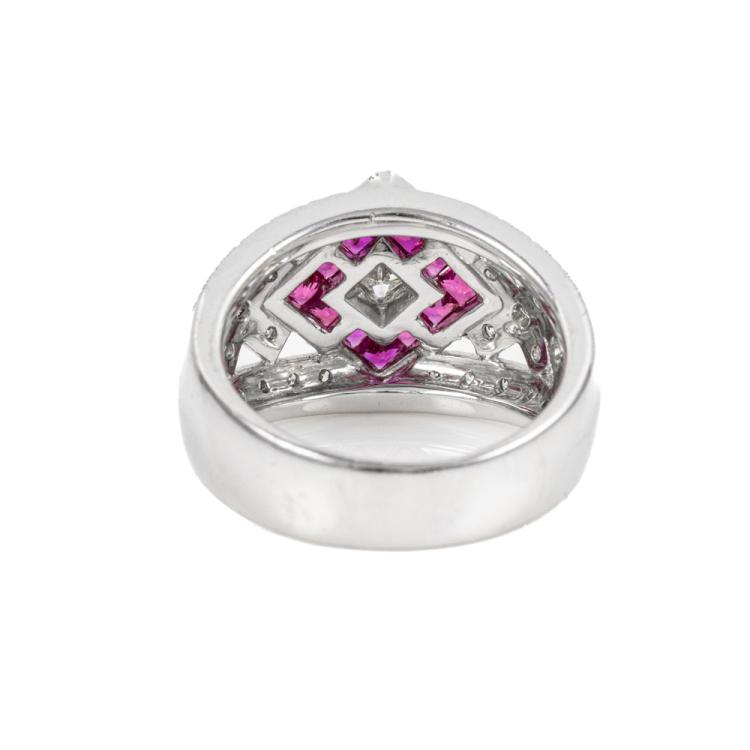 Ruby and Diamond ring with princess cut Natural Rubies totalling 0.62cts and round & princess cut Natural Diamonds totalling 0.58cts (Estimated grading: G VS-SI). Platinum 900. Ring size L. Band width: 5mm - 8.3mm. Weight: 13.7g. (Pre-owned)