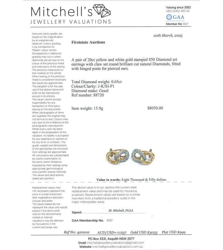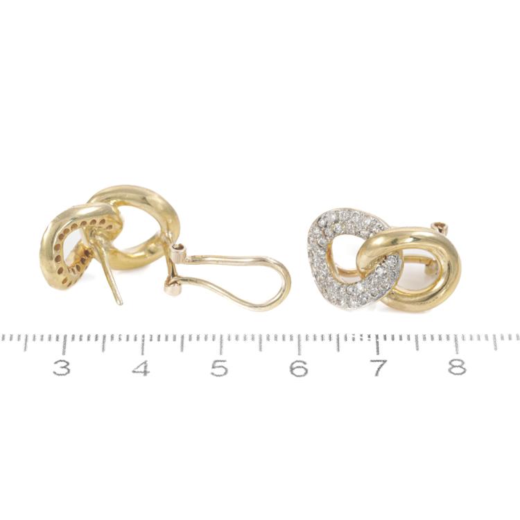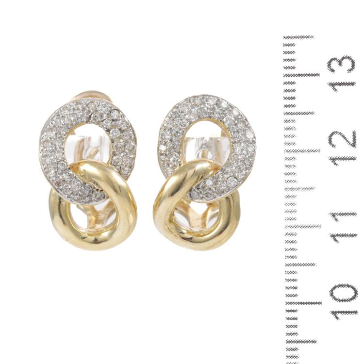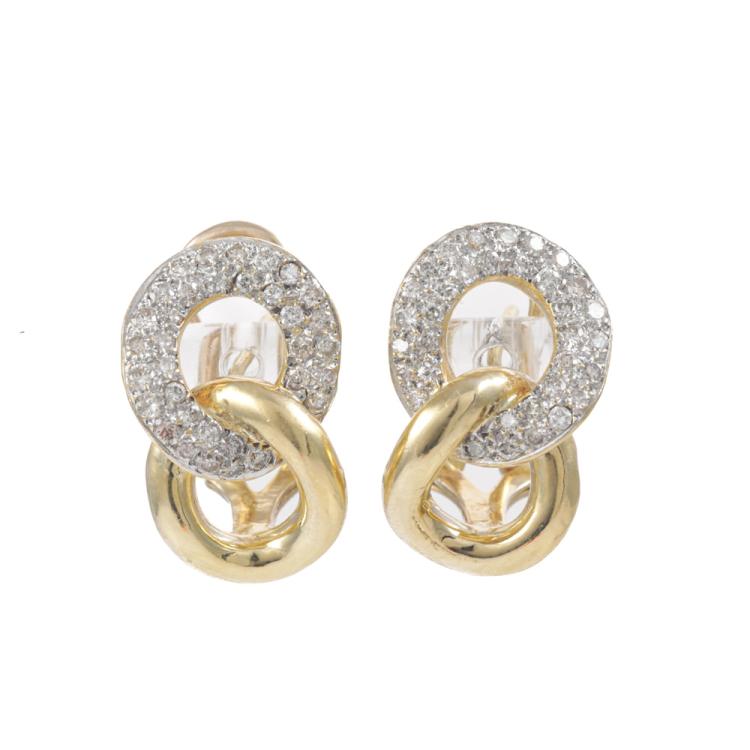 Diamond clip-on earrings (for pierced ears) with round Natural Diamonds totalling 0.65ct. (Estimated grading: J-K SI-P1). 20ct yellow gold (stamped 850). Weight: 15.9g. With Valuation Certificate. (Pre-owned)