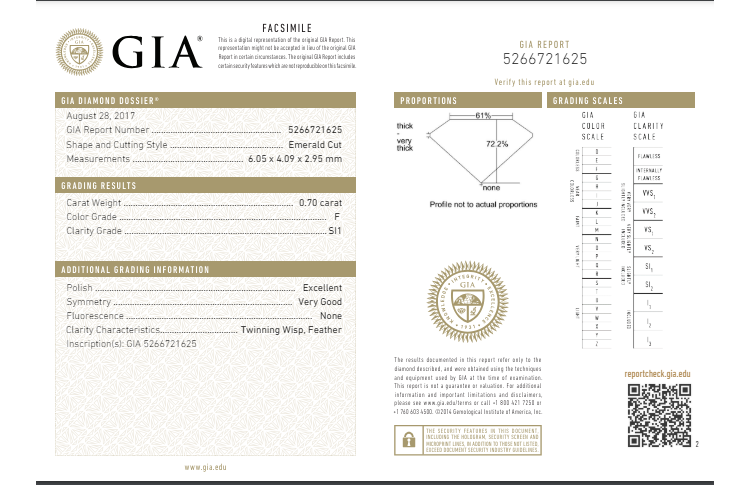 Handmade Diamond halo ring with a centre emerald cut natural Diamond of 0.70ct (with copy of GIA Diamond dossier graded as F SI1 #5266721625) and round natural Diamonds totalling approximately 0.18ct. 18ct white gold. Ring size I 1/2. Band width: 1.5mm. Weight: 3.0g. With Natalie Marie box. (Pre-owned)