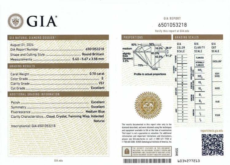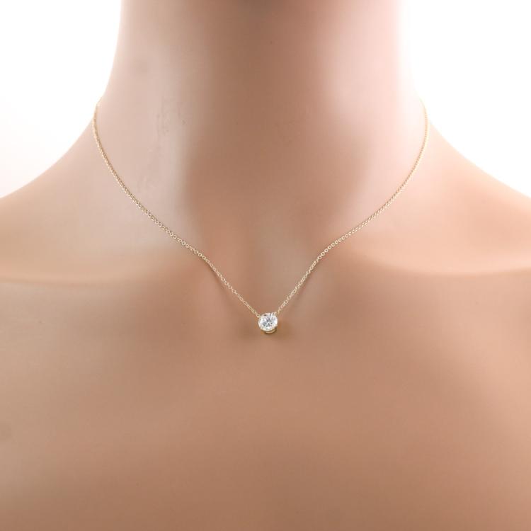 Diamond solitaire pendant with a round brilliant cut Natural Diamond of 0.70ct (with GIA Dossier Report graded as E VS1 #6501053218). 18ct yellow gold with 18ct yellow gold attached chain. Length: 41cm. Weight 2.0g. (New)