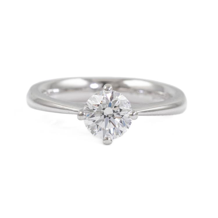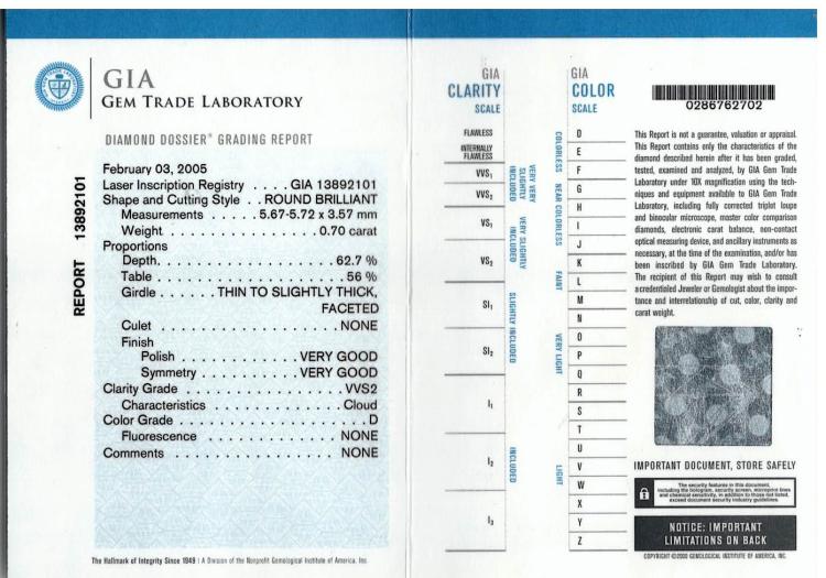 Diamond solitaire ring with round brilliant cut natural Diamond of 0.70ct (With GIA Report graded as D VVS2 #13892101). 18ct white gold. Ring size H. Band width: 3mm - 1.1mm. Weight: 3.4g. (Pre-owned)