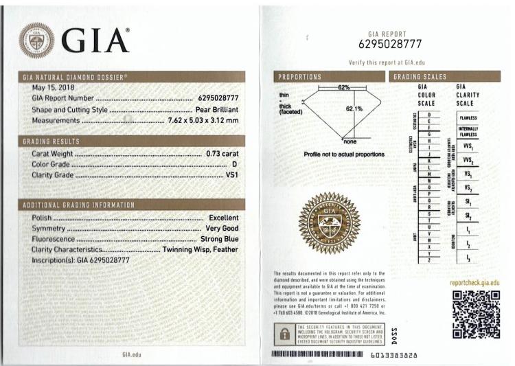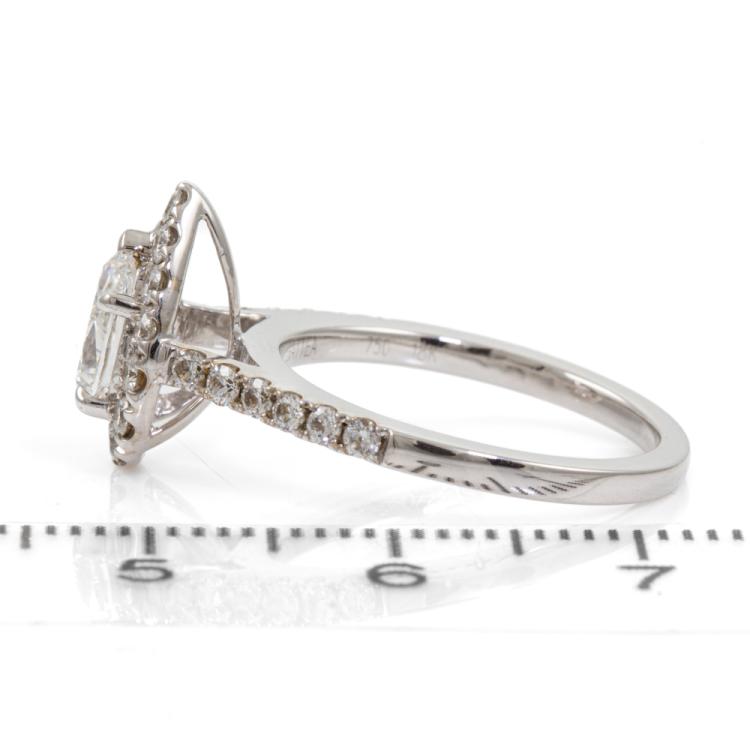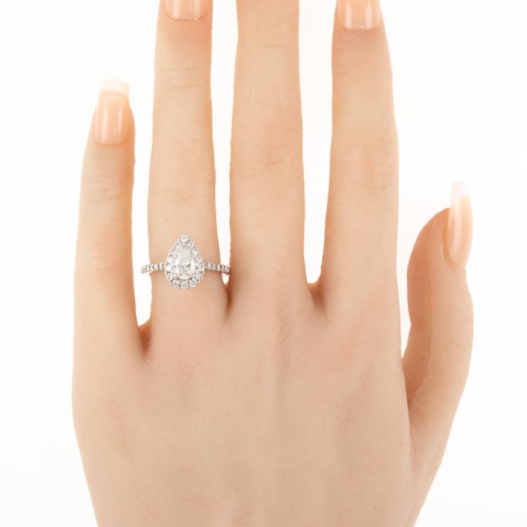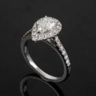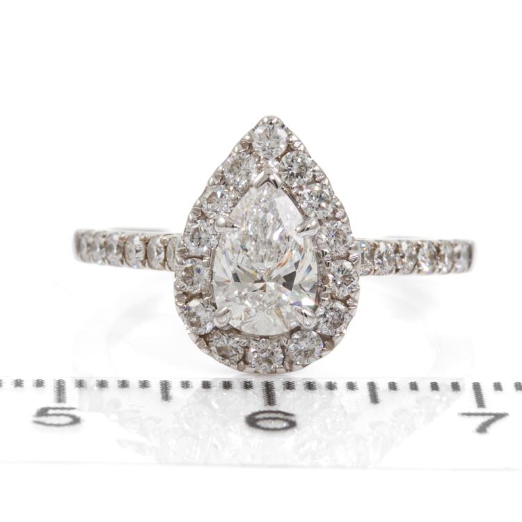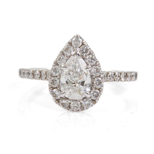 Diamond halo ring with a centre pear shape natural Diamond of 0.73ct (with GIA Diamond Dossier graded as D VS1 #6295028777) and remaining round natural Diamonds totalling 0.54cts (F-G VS-SI). 18ct white gold. Ring size K1/2. Band width: 1.6mm-1.9mm. Weight: 4.3g. With Gattea Valuation dated 07/08/18. Stamped "Gattea". (Pre-owned)