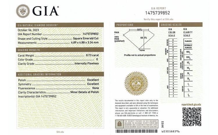 A loose square emerald natural Diamond of 0.73ct (with GIA Summary Report graded as E Internally Flawless # 1475739852). (New)