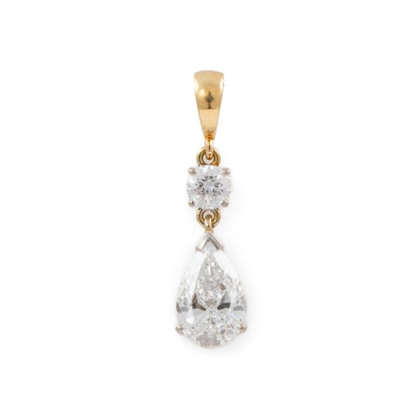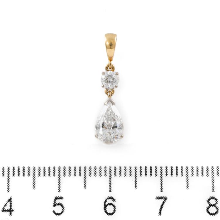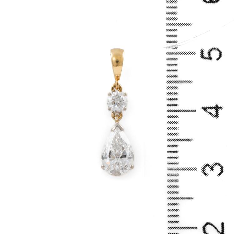 Diamond pendant with a pear cut natural Diamond of 0.82ct (with GIA Report graded as D SI1 #16914009) and a round natural Diamond of approximately 0.14ct. 18ct yellow and white gold. No chain provided. Weight: 1.2g. (Pre-owned)