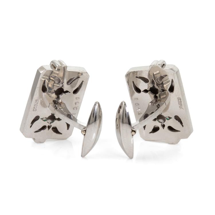 Cufflinks with 2 emerald cut natural Emeralds totalling 0.83ct. Platinum - 900 with brushed metal finish. Size: 2.0cm x 1.5cm. Weight: 32.8g. (Pre-owned)