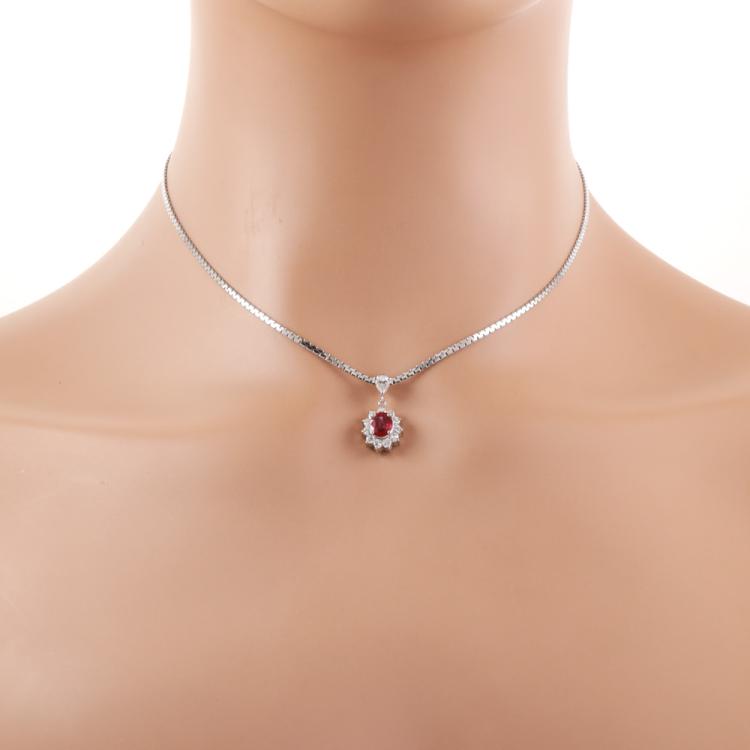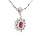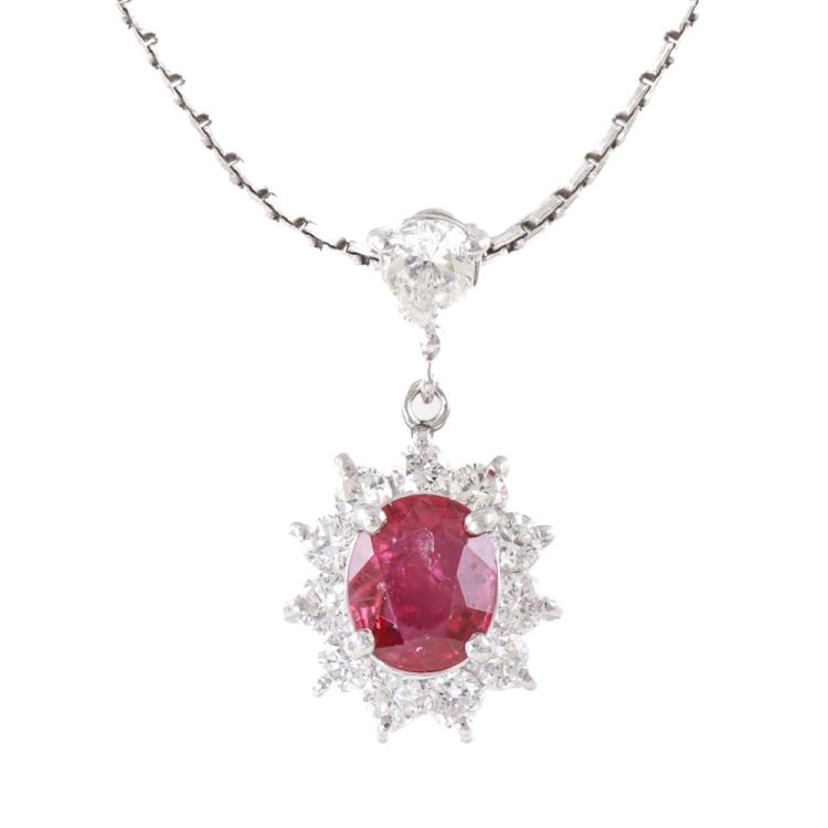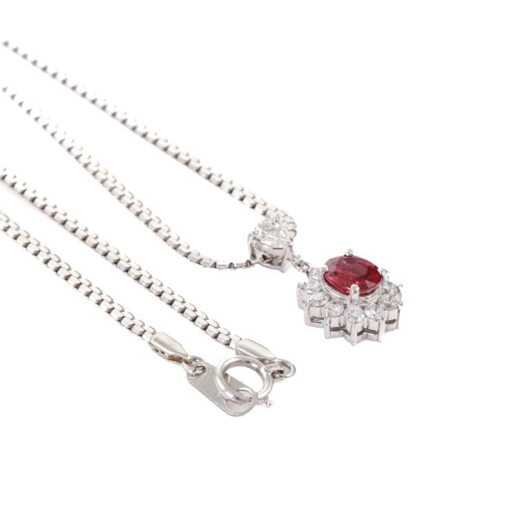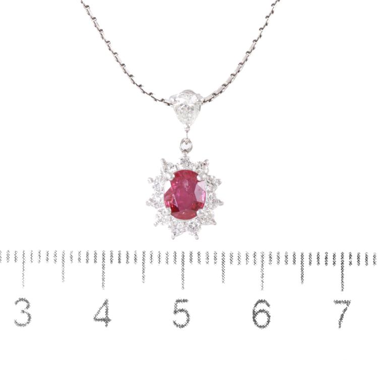 Ruby and Diamond pendant with oval shape Natural Ruby of 0.83ct, round & pear shape Natural Diamonds totalling 0.58ct (Estimated grading: I-J SI). Platinum 850 with 38cm Platinum 850 chain. Weight: 9.1g. (pre-owned)