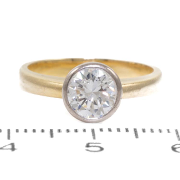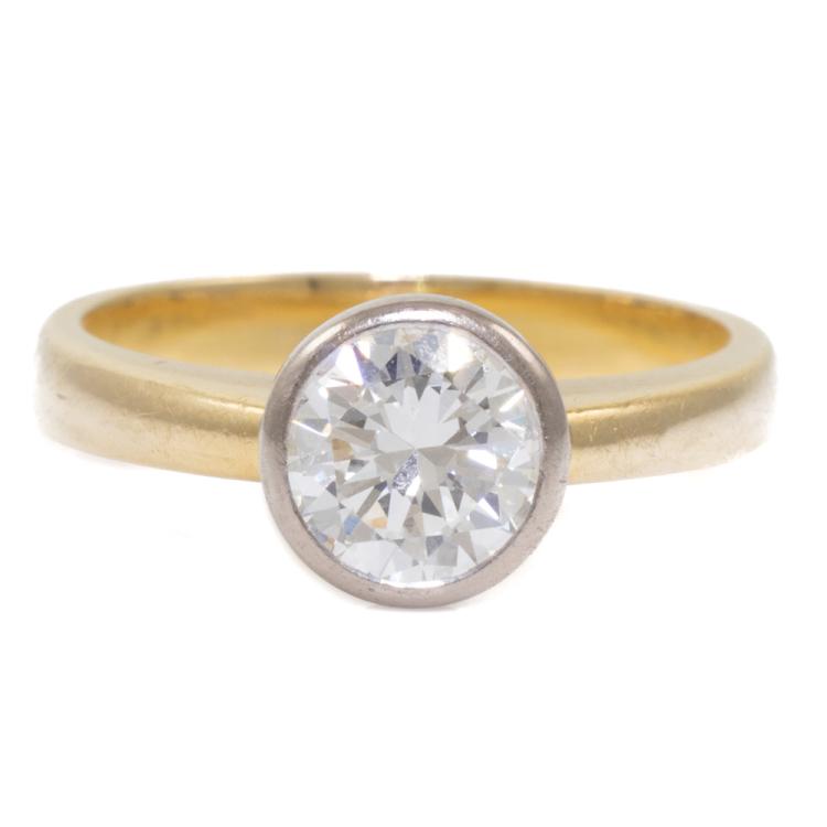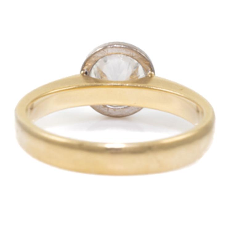 Diamond solitaire ring with round brilliant cut natural Diamond of 0.85ct (Estimated Grading: H-I VS2). 18ct yellow and white gold. Ring size: J. Band width: 3mm - 2.1mm. Weight: 3.8g.