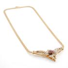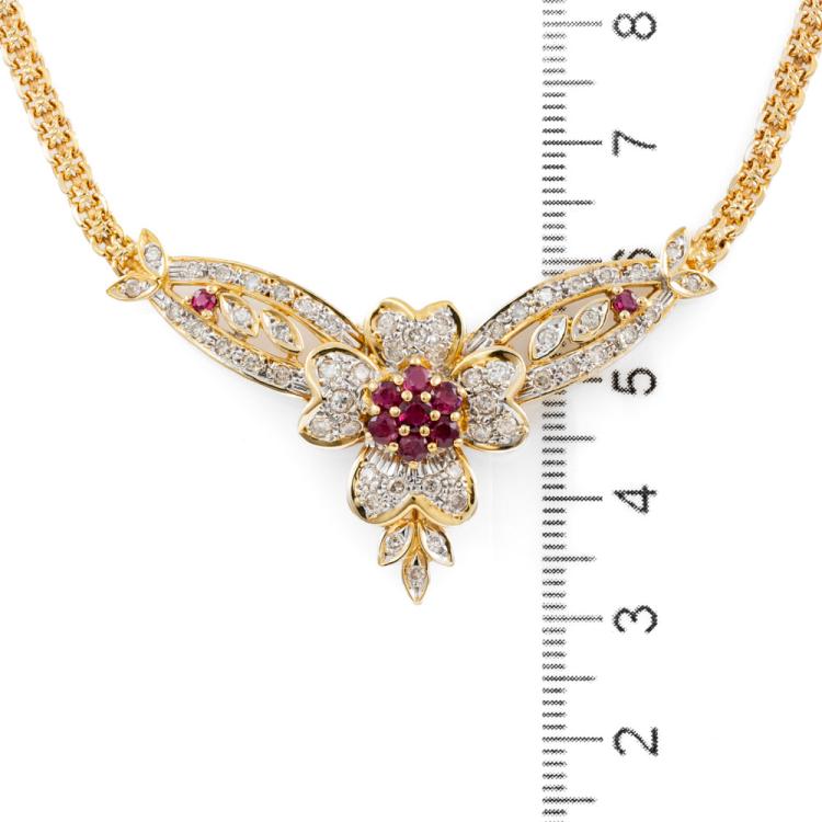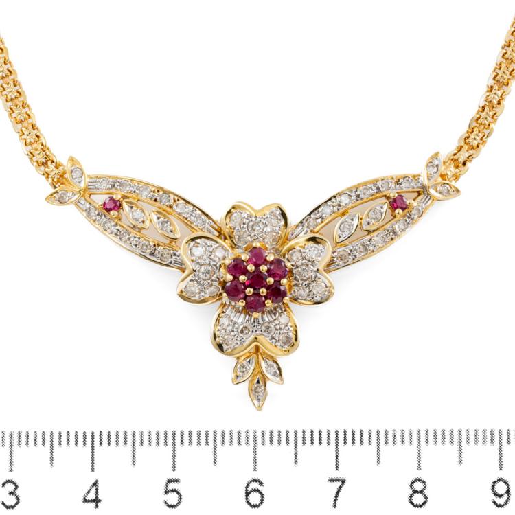 Ruby and Diamond necklace with round natural Rubies totalling 0.88ct and natural Diamonds totalling 1.03ct (Estimated grading: I-J SI-P1). 18ct yellow and white gold with 42.0cm chain. Weight: 18.7g. With certificate #418504. (Pre-owned)