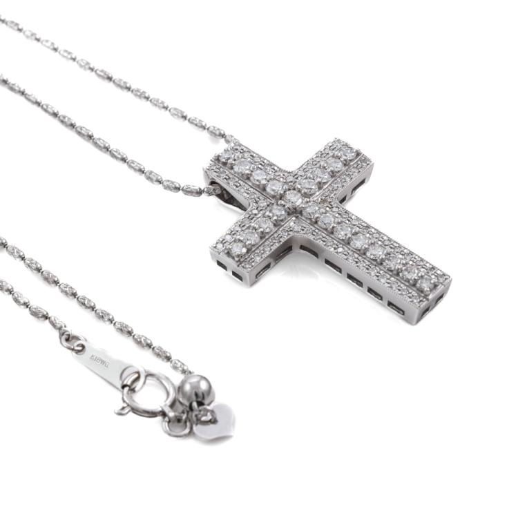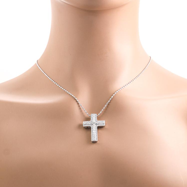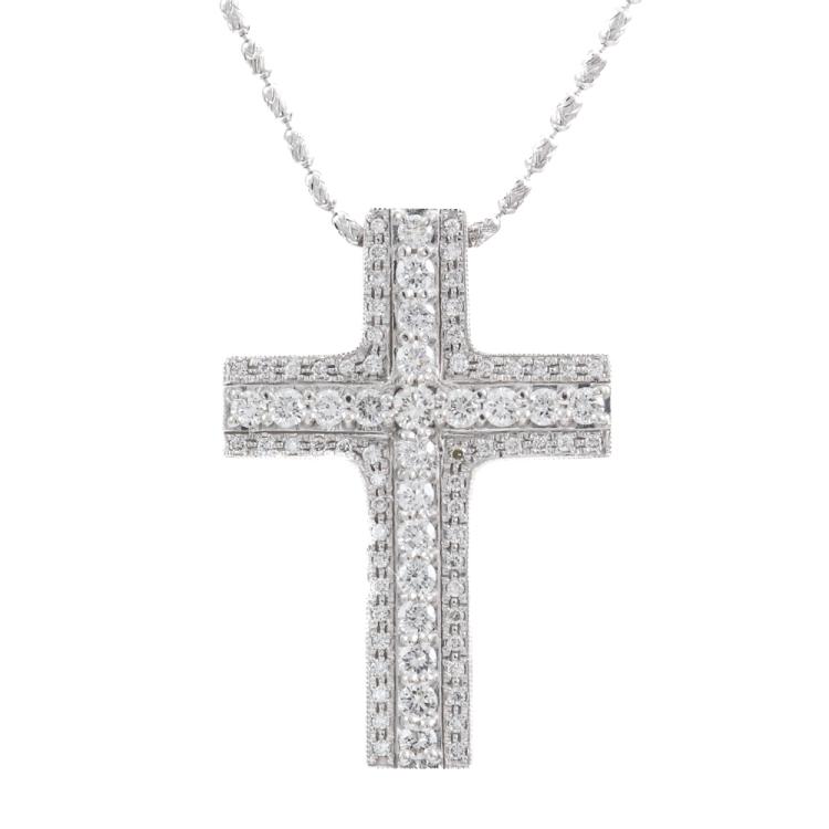 Diamond cross pendant with round Natural Diamonds totalling 1.00ct (Estimated grading: H-I VS-SI). 18ct white gold with 61cm 18ct white gold chain. Weight: 9.5g. (Pre-owned)