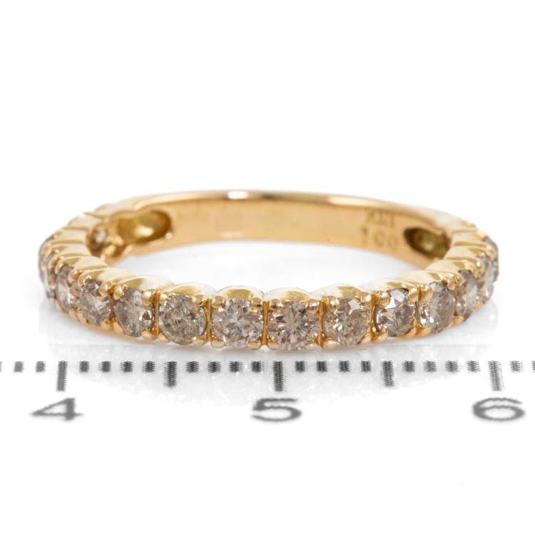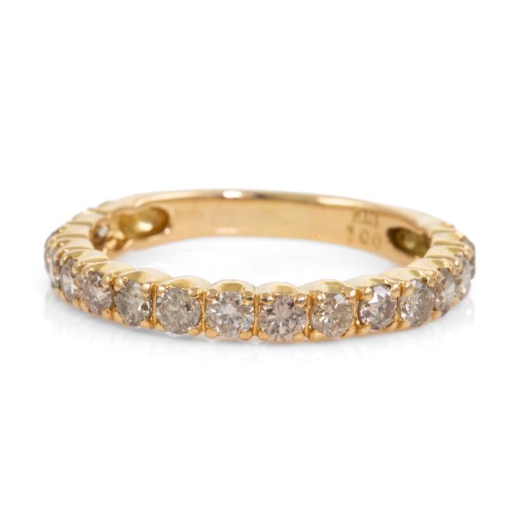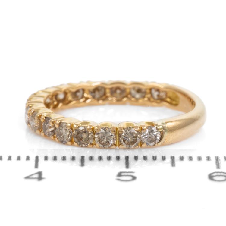 Diamond eternity ring with round natural Diamonds totalling 1.00cts (Estimated grading: Champagne P1). 18ct yellow gold. Ring size N - ring resize is not recommended. Weight: 2.4g. (Pre-owned)
