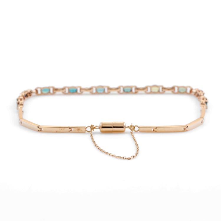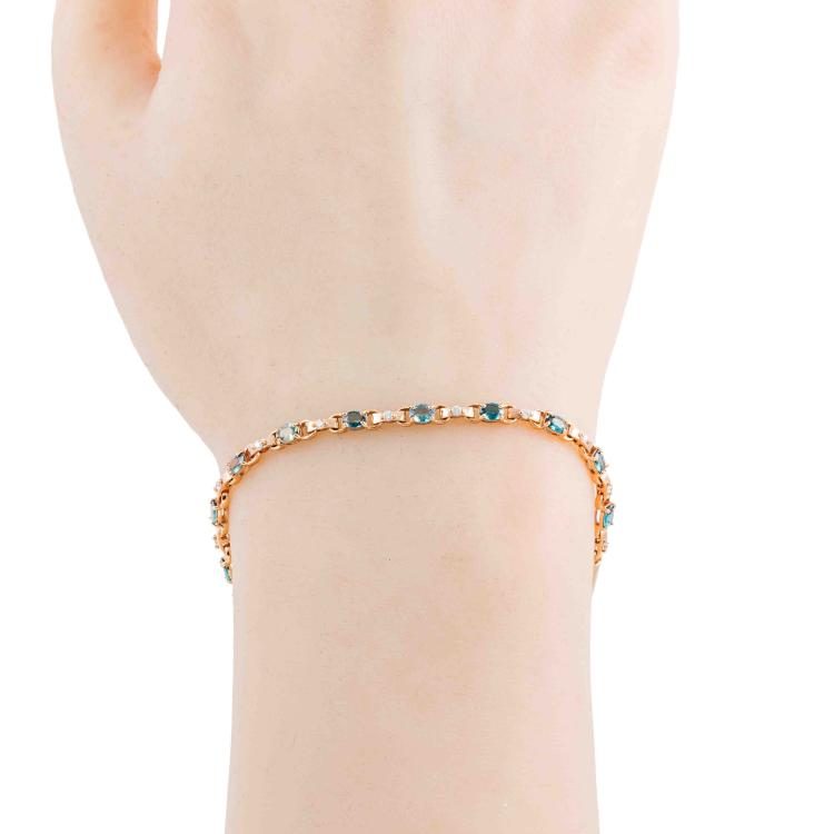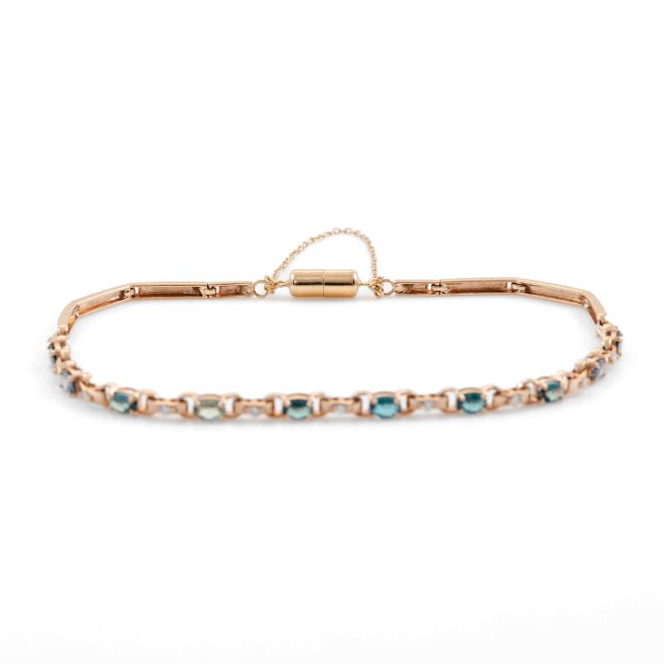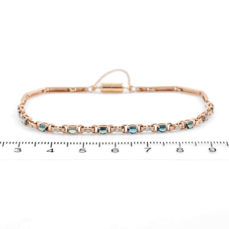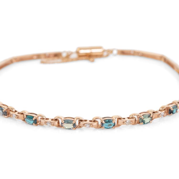 Alexandrite and Diamond bracelet with oval shape Natural Alexandrites totalling 1.02ct (displaying colour change from bluish green to light purple) and round Natural Diamonds totalling 0.13ct. 18ct rose gold with magnet clasp and safety chain. Length: 19cm. Weight 5.5g. (Pre-owned)