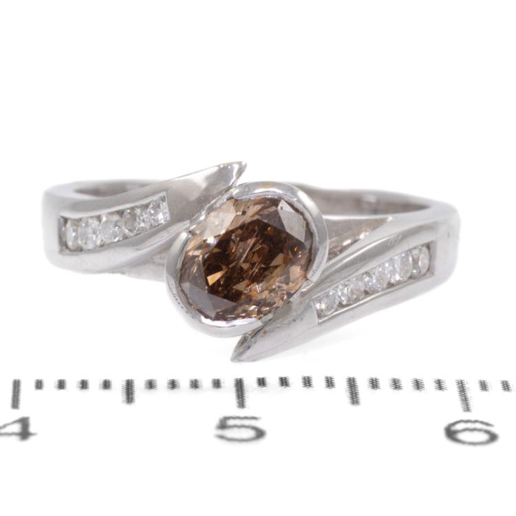 Diamond ring with centre oval shape natural Champagne Diamond of 1.04ct (Estimated grading: Dark Champagne SI2) and round shoulder natural white Diamonds totalling 0.19ct. 18ct white gold. Ring size N. Band width: 2.7mm-3.5mm. Weight: 5.7g. (As new)
