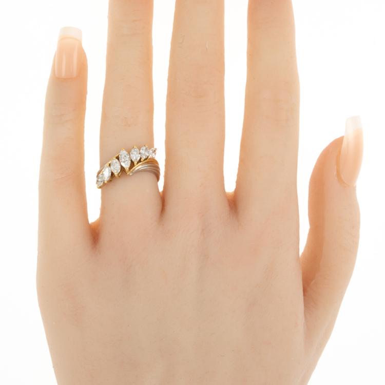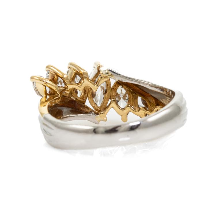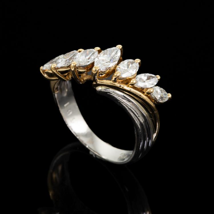 Diamond dress ring with 7 marquise cut Natural Diamonds totalling 1.05cts (Estimated grading: G-H VS-SI). 18ct yellow gold and platinum 900. Ring size J. Band width: 2.8mm - 3.9mm. Weight: 4.9g. (Pre-owned)